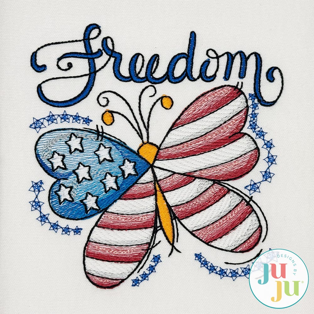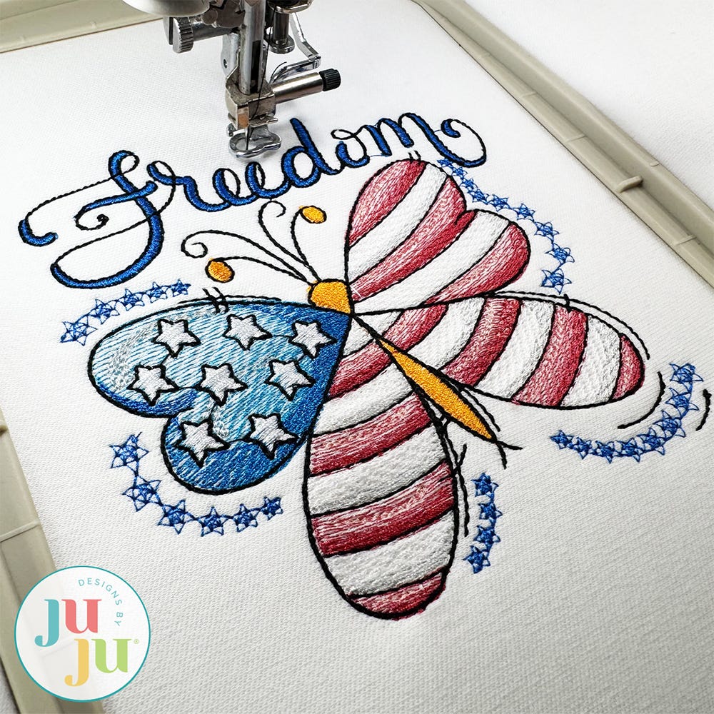 Set your creativity free with this beautiful patriotic butterfly! Our embroidery-only single design showcases a butterfly dressed in it's patriotic best surrounded by stars and finished with the word "Freedom".