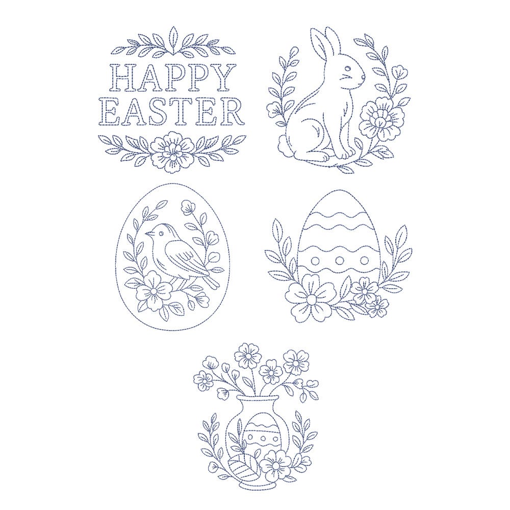 Hop onto even more beautiful Easter stitching with our Easter Bluework 2 embroidery design set! This set includes five more gorgeous embroidery-only Easter designs in a delicate bean-stitch style. Each design is done in a single color.