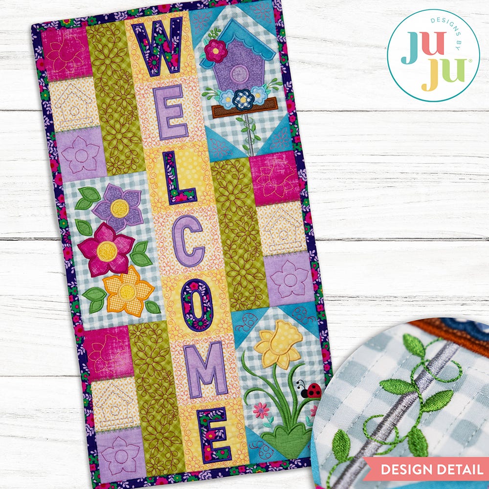 Extend a bright and cheerful greeting to your guests with our Spring Welcome Wall Hanging! This project features an applique birdhouse, flower trio and daffodil, as well as patchwork blocks with different quilting motifs. The satin stitch applique lettering is included in the design files, as pictured.