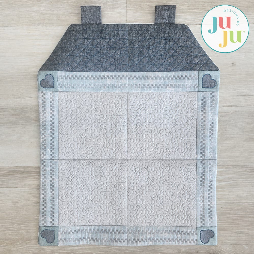 Requires 10 hoopings. Fourteen blocks are stitched completely in the hoop, then joined together with your sewing machine. The backing and tabs are also added with your sewing machine.