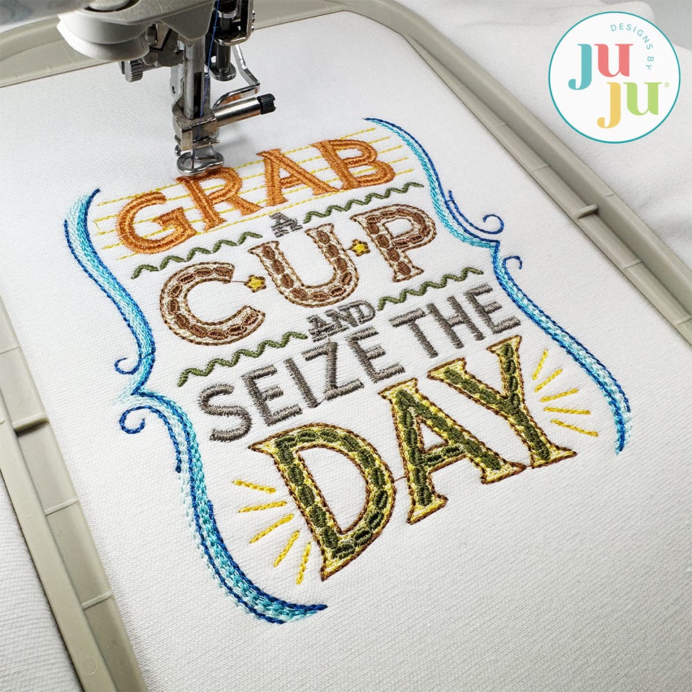Grab a Cup and Seize the Day! Pep up your projects with our delightful embroidery-only word art design! Featuring a fun saying accented with a decorative frame and other embroidery elements.