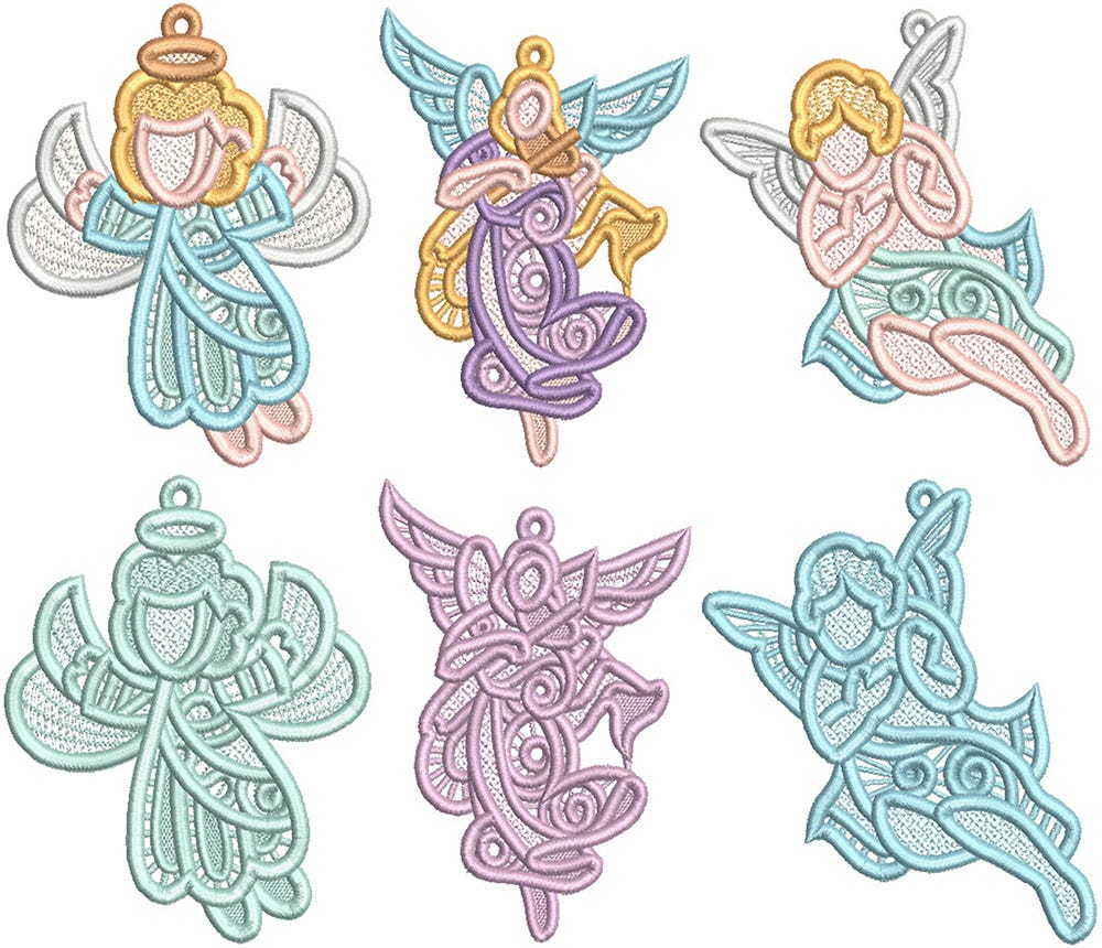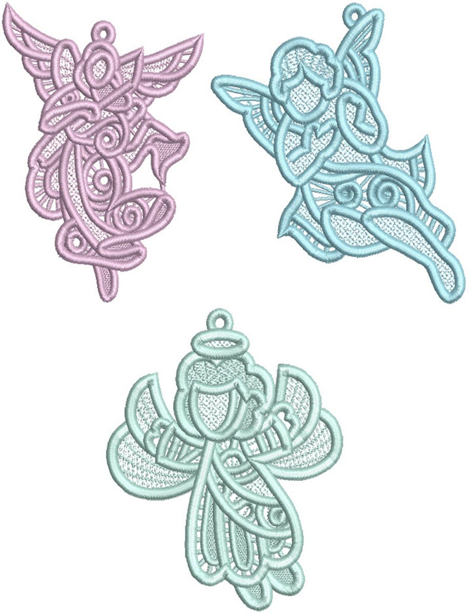 3 elegant free standing lace angels! Includes option for single or multiple thread colors.