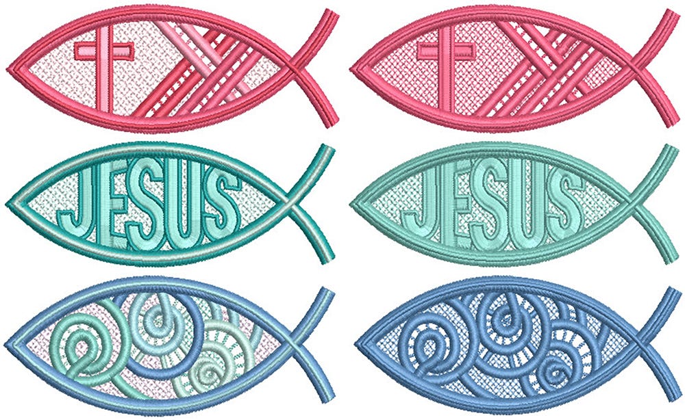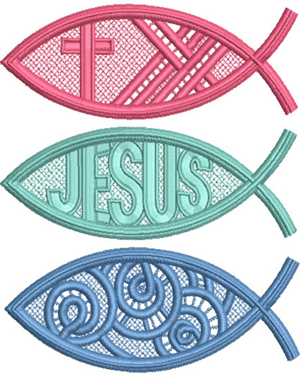 3 elegant free standing lace Christian Fish! Includes option for single or multiple thread colors.