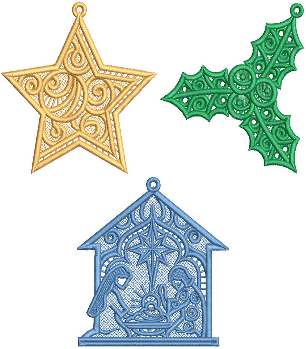 3 elegant free standing lace Christmas designs! Includes option for single or multiple thread colors. Stitch these beautiful lace designs onto a non-woven fiber mesh water soluble stabilizer such as Sulky Fabri-Solvy then gently rinse to leave only the thread, creating these beautiful free standing lace designs.