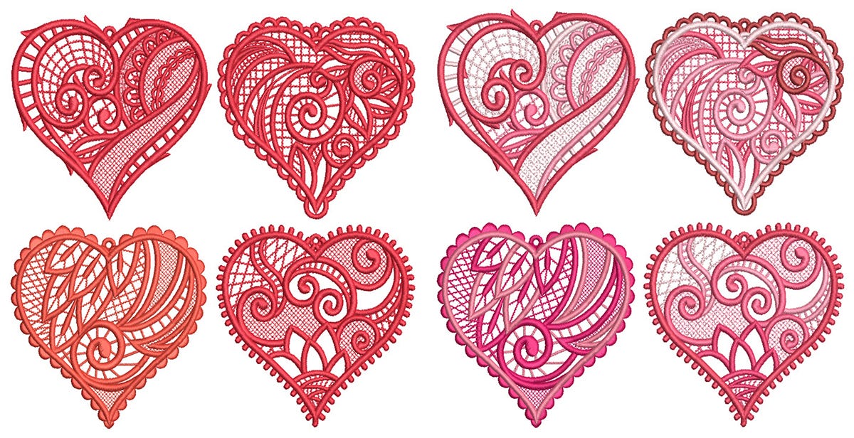 4 more lovely, free standing lace heart designs! Includes option for single or multiple thread colors.