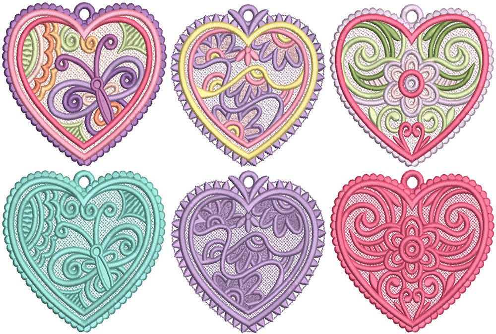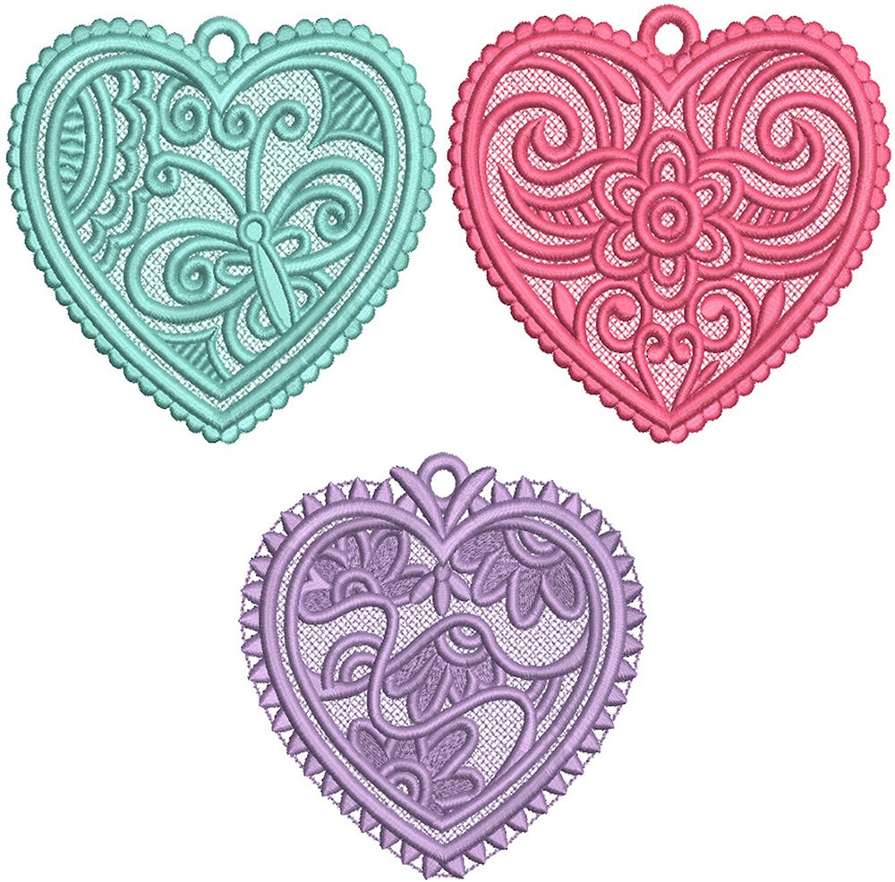 3 elegant free standing lace hearts! Includes option for single or multiple thread colors.