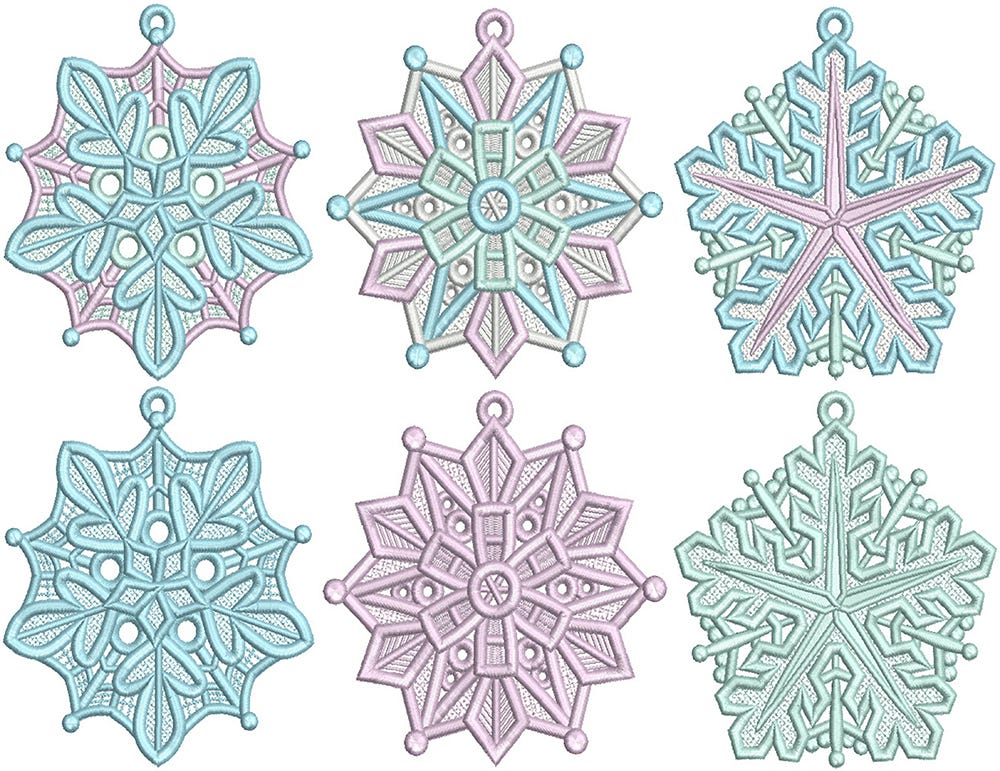 3 elegant free standing lace snowflakes! Includes option for single or multiple thread colors.