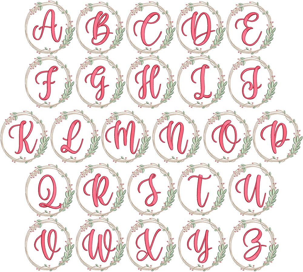Freya Monogram is a satin stitch wreath with satin stitch lettering. Due to its larger size, please note the 6" size features