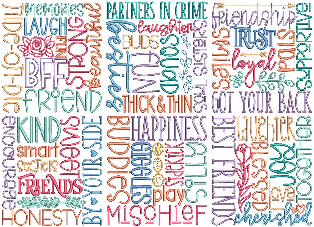 6 super fun and endearing friendship themed subway art designs! These designs are embroidery-only featuring satin stitch lettering with satin and bean stitch design details.