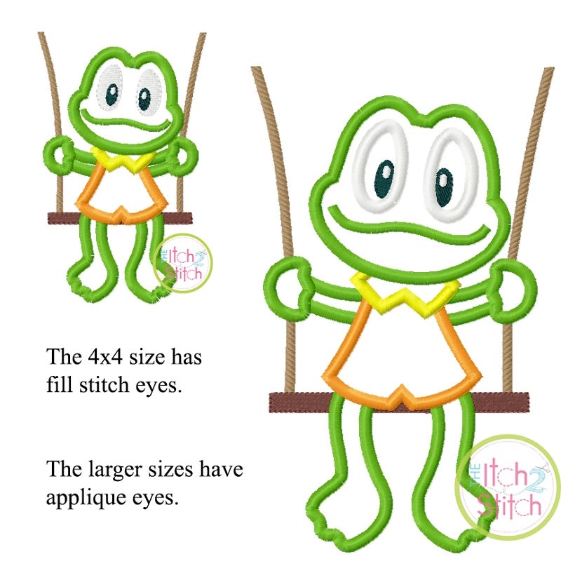 The 4x4 size has fill stitch eyes, the larger sizes have applique eyes.