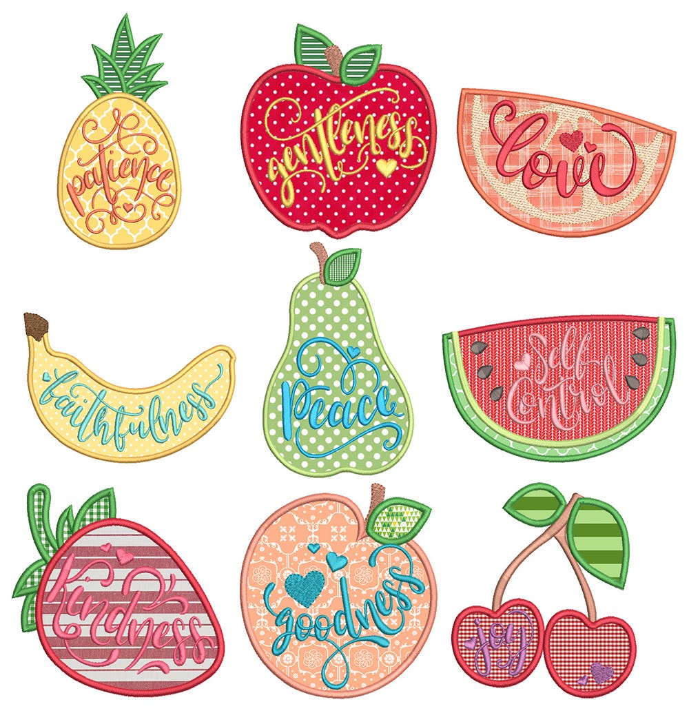 9 pretty and sweet fruits of the Spirit designs in applique!