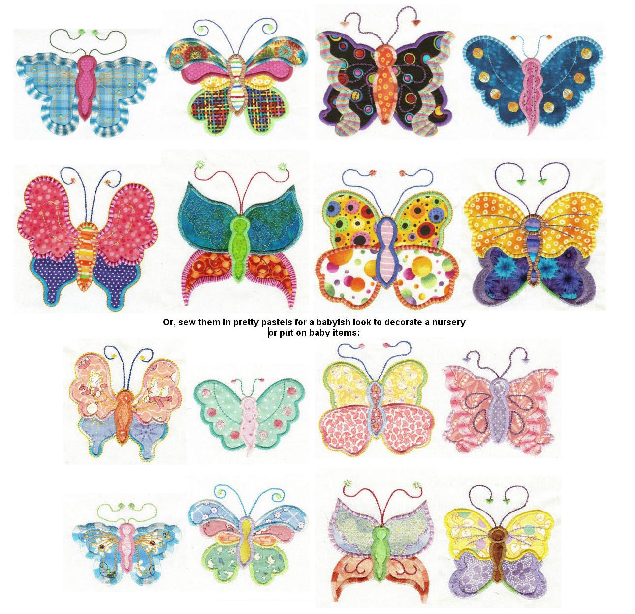 Here is a fabulous set of applique butterflies to get you in the mood for warmer weather! Make them up in fun, bright and funky fabrics, or lighter pastels as seen below to decorate baby apparal or a nursery! Have fun!