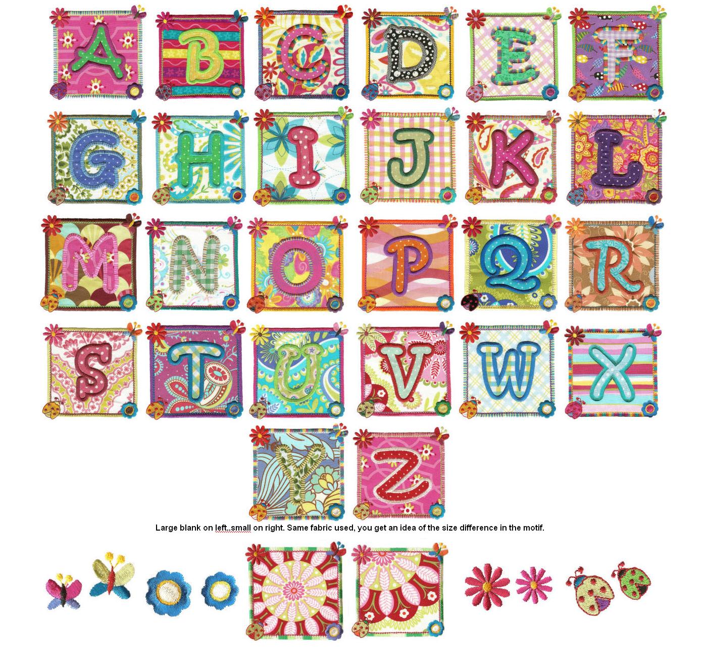 Here is a beautiful, whimsical alphabet set that will scream SPRING! Utilize your various fabrics to achieve a wide variety of looks. Each letter patch comes in a 4 inch
