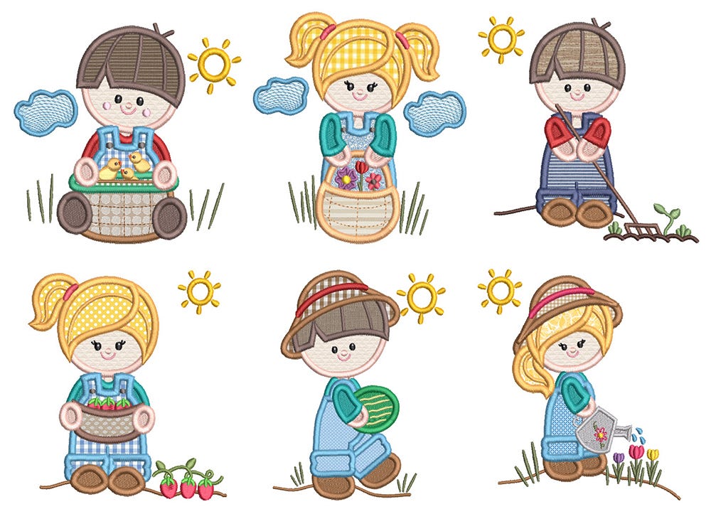 6 super sweet gardening kids in applique!