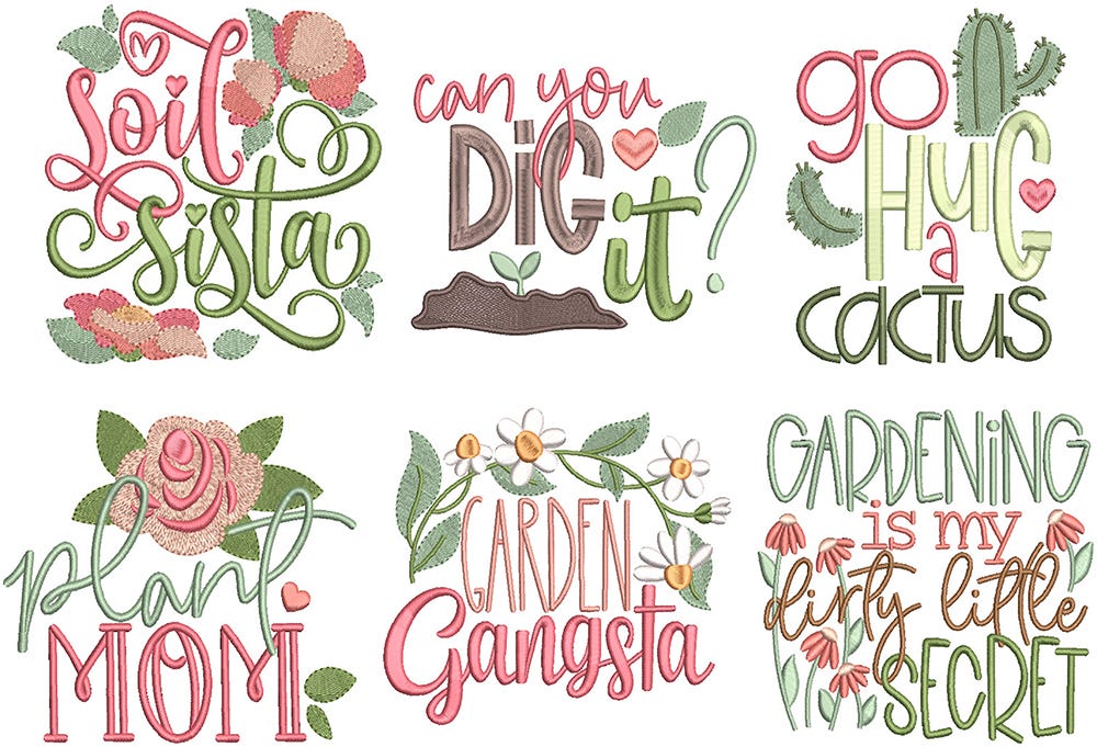 6 beautiful gardening themed word art designs! These designs are embroidery-only - primarily satin stitch lettering with