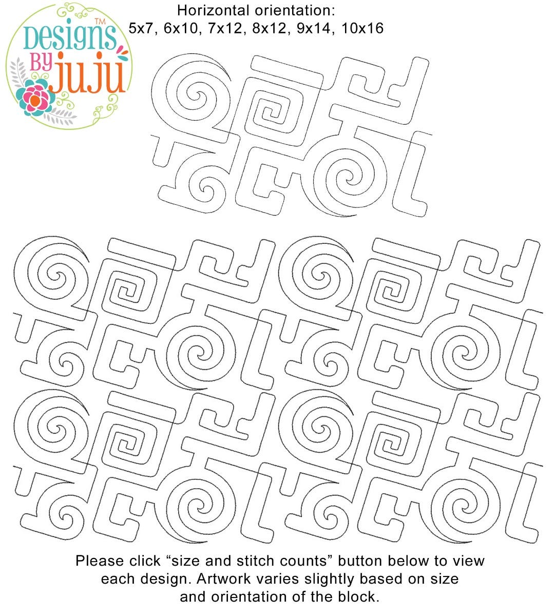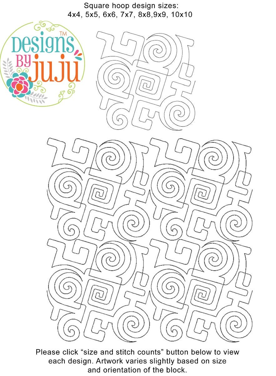 Please note: Both the scale of each pattern and arrangement of the motifs may vary based on the hoop size. Please click the "Size and Stitch Count" button to view the artwork for each size.