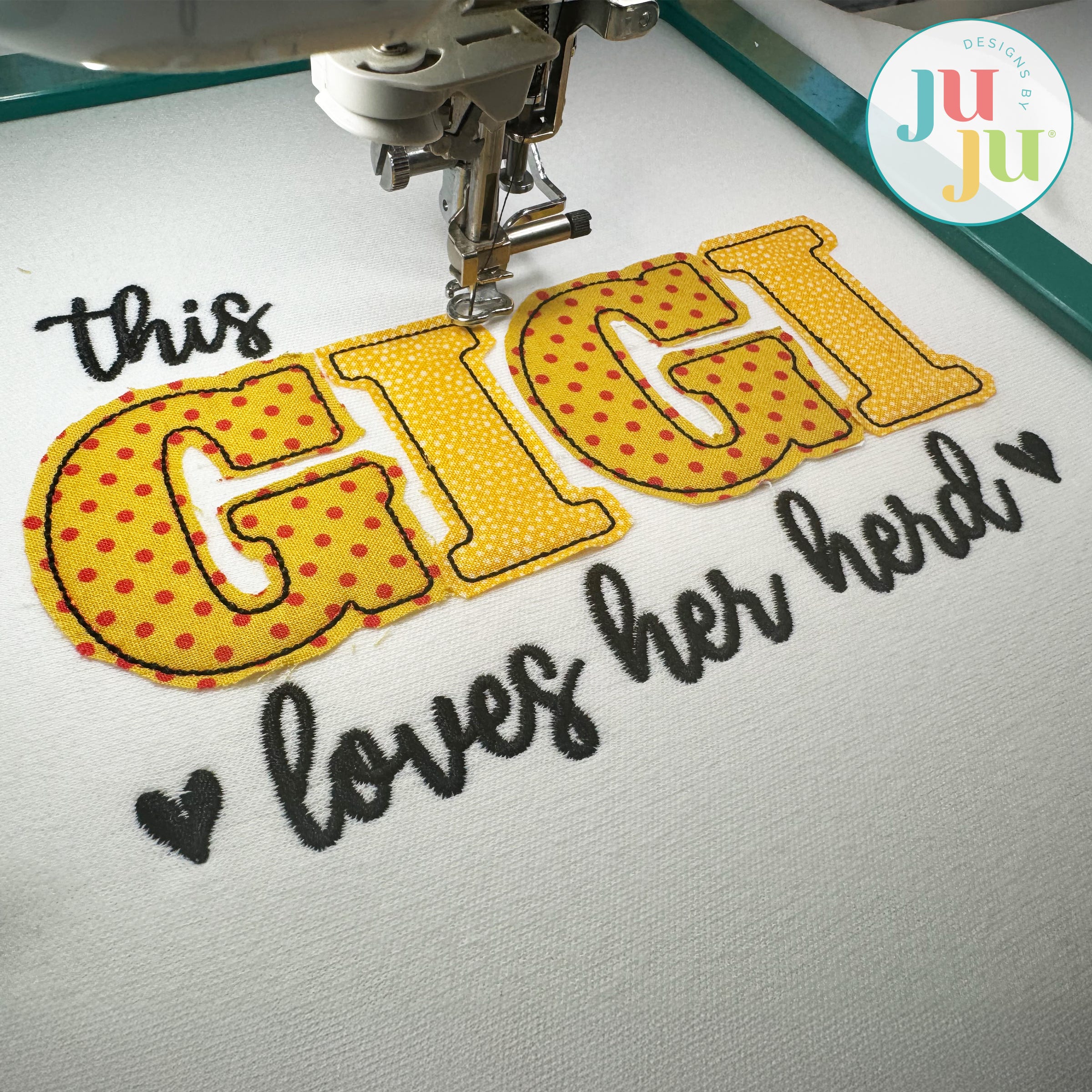 This Gigi Loves Her Herd! The design set includes one applique in four sizes (4x4, 5x7, 6x10 and 8x8), plus two fill stitch Mini Highland Cows that can be used to customize your project. Add the number of boy and/or girl minis to represent your herd. Place them under the applique design or on the sleeve of a shirt; personalize with the font of your choice!