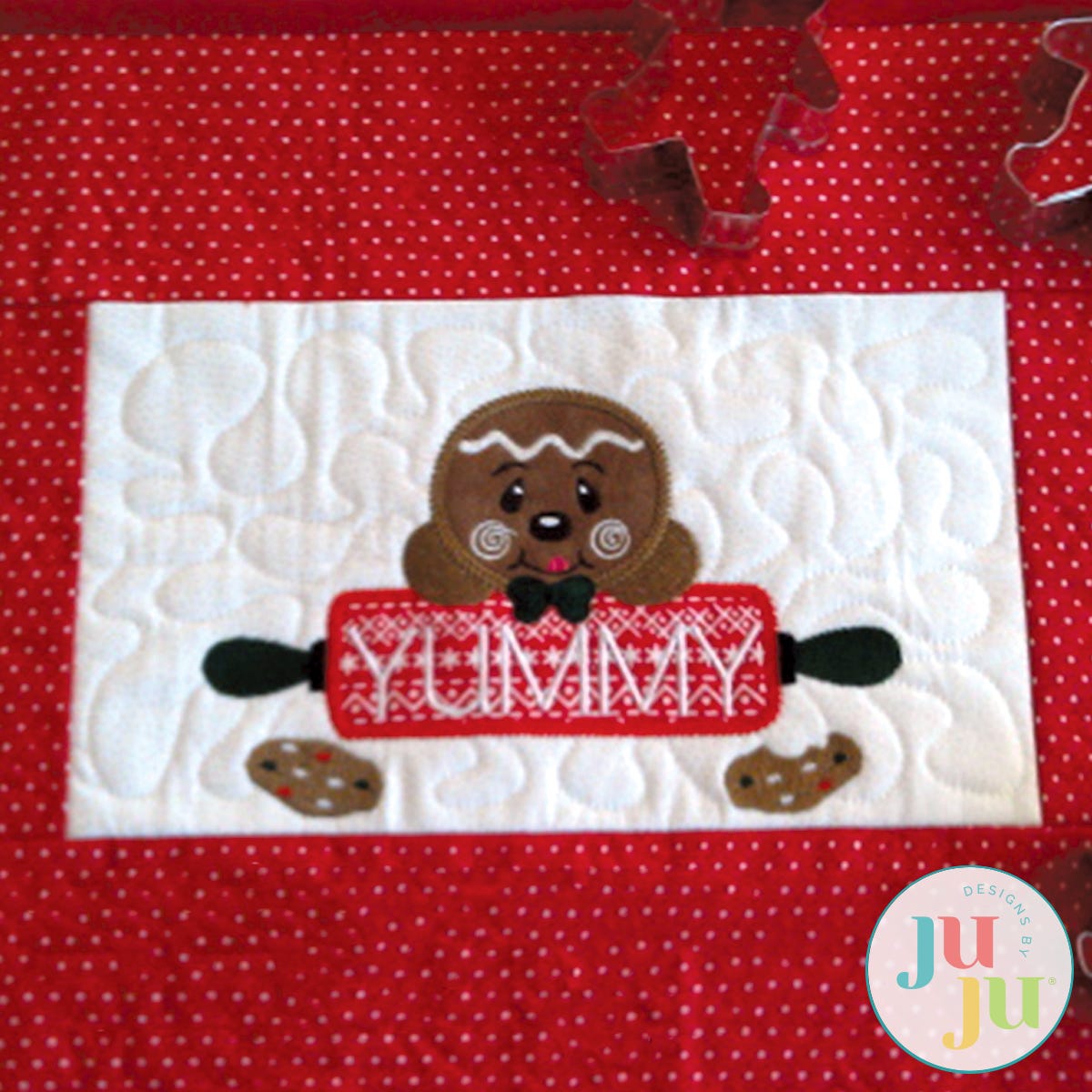 This fun applique design comes in two versions: a boy gingerbread peeking over a rolling pin as well as a girl. Wouldn't this make a great design for an apron or a towel?