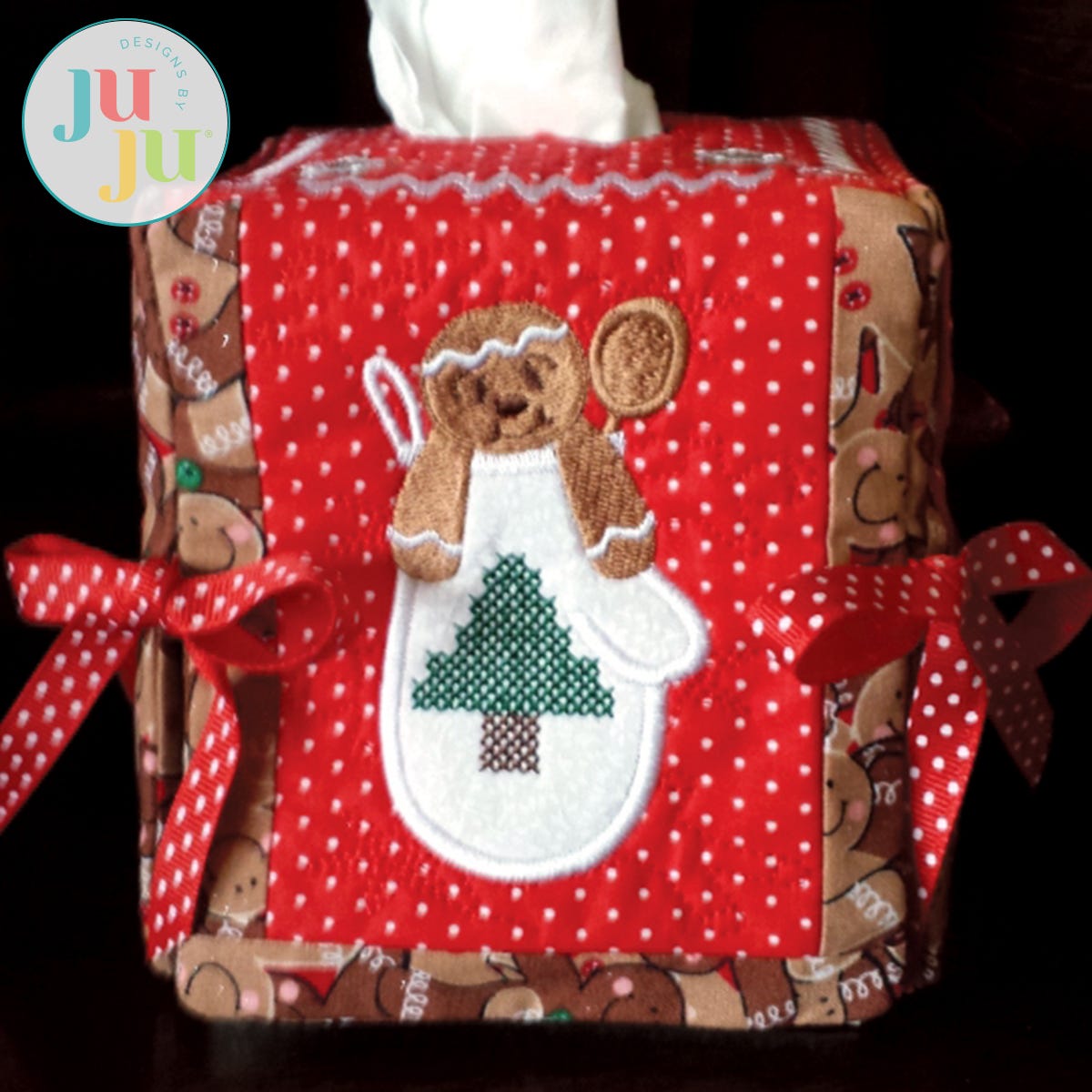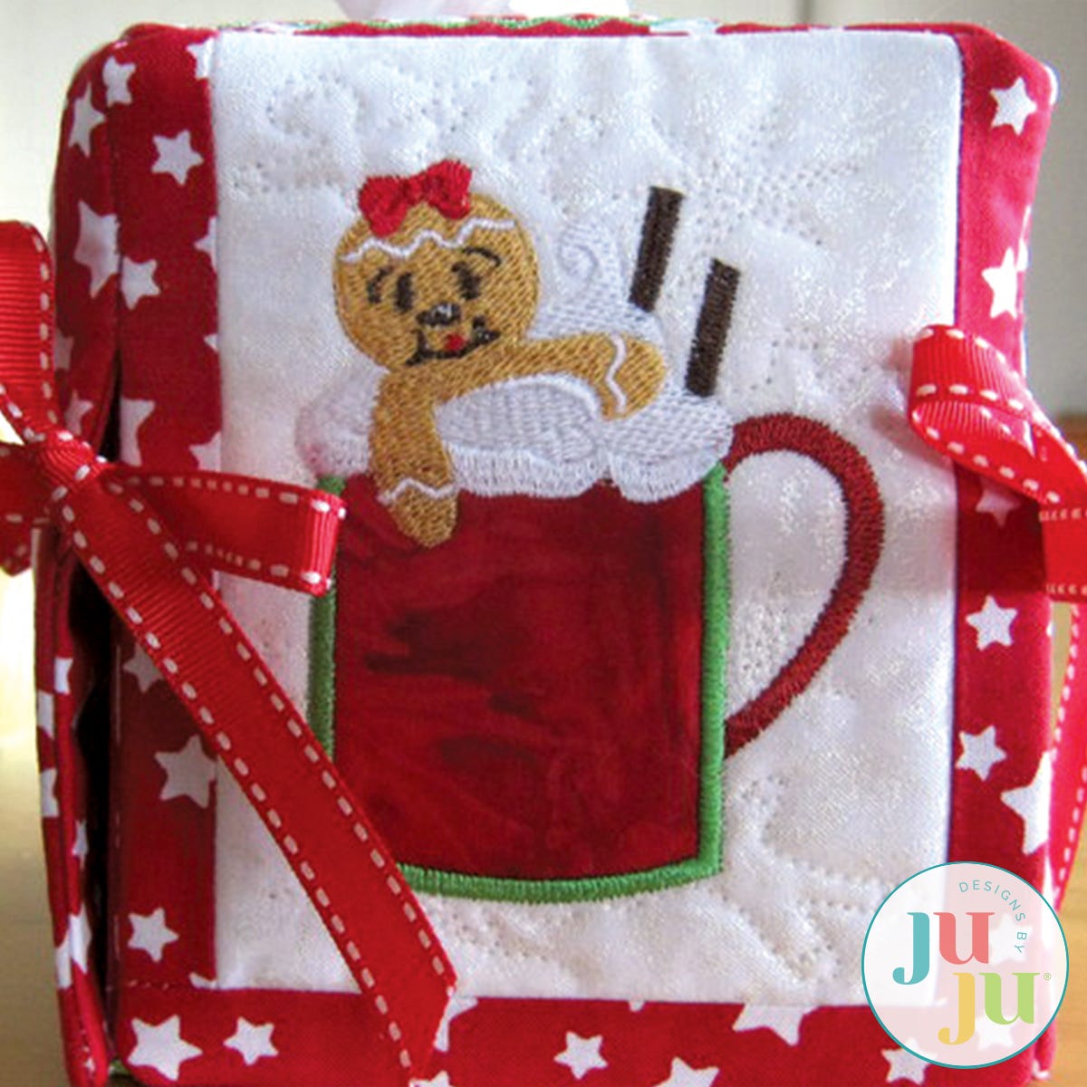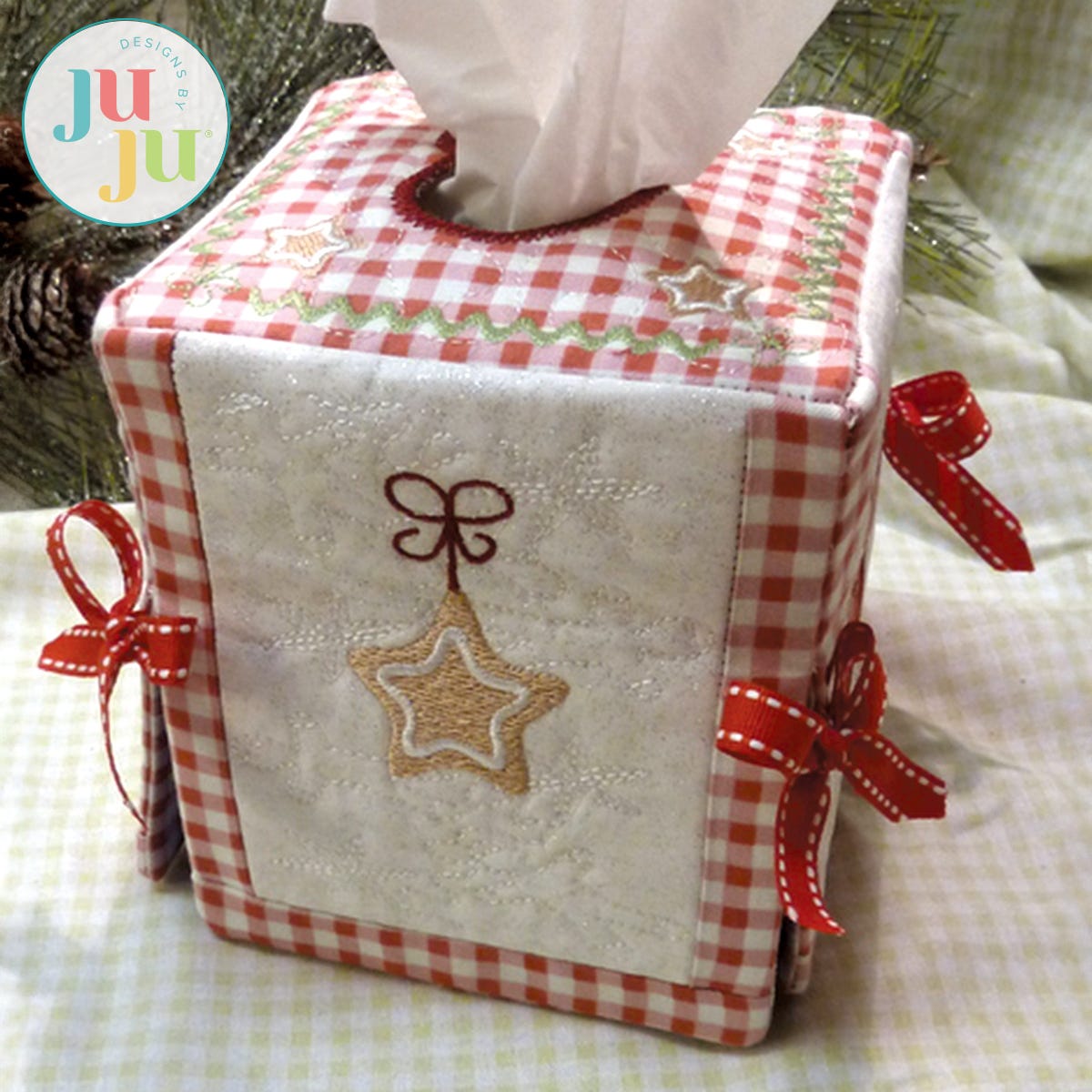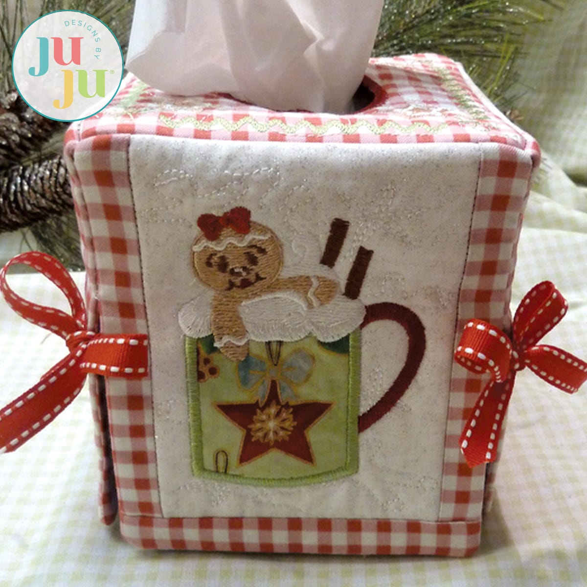 This tissue box cover will add a touch of whimsy to your Christmas decorating. Each side and top is stipple quilted, lined, and pieced together in the hoop. Ribbons tied at the sides further enhance the whimsical feel. There is a small amount of hand sewing required. The tissue box size used for this cover is approximately 4.5" x 4.5" x 5" tall. Files include a top and three sides - Side 4 is a repeat of side 2.