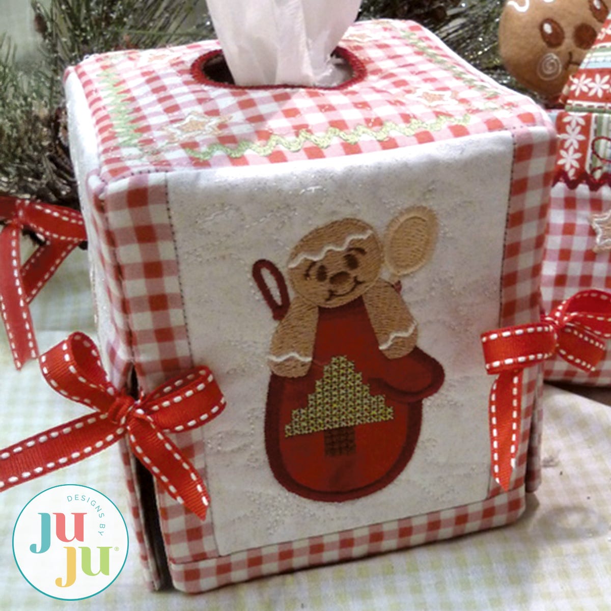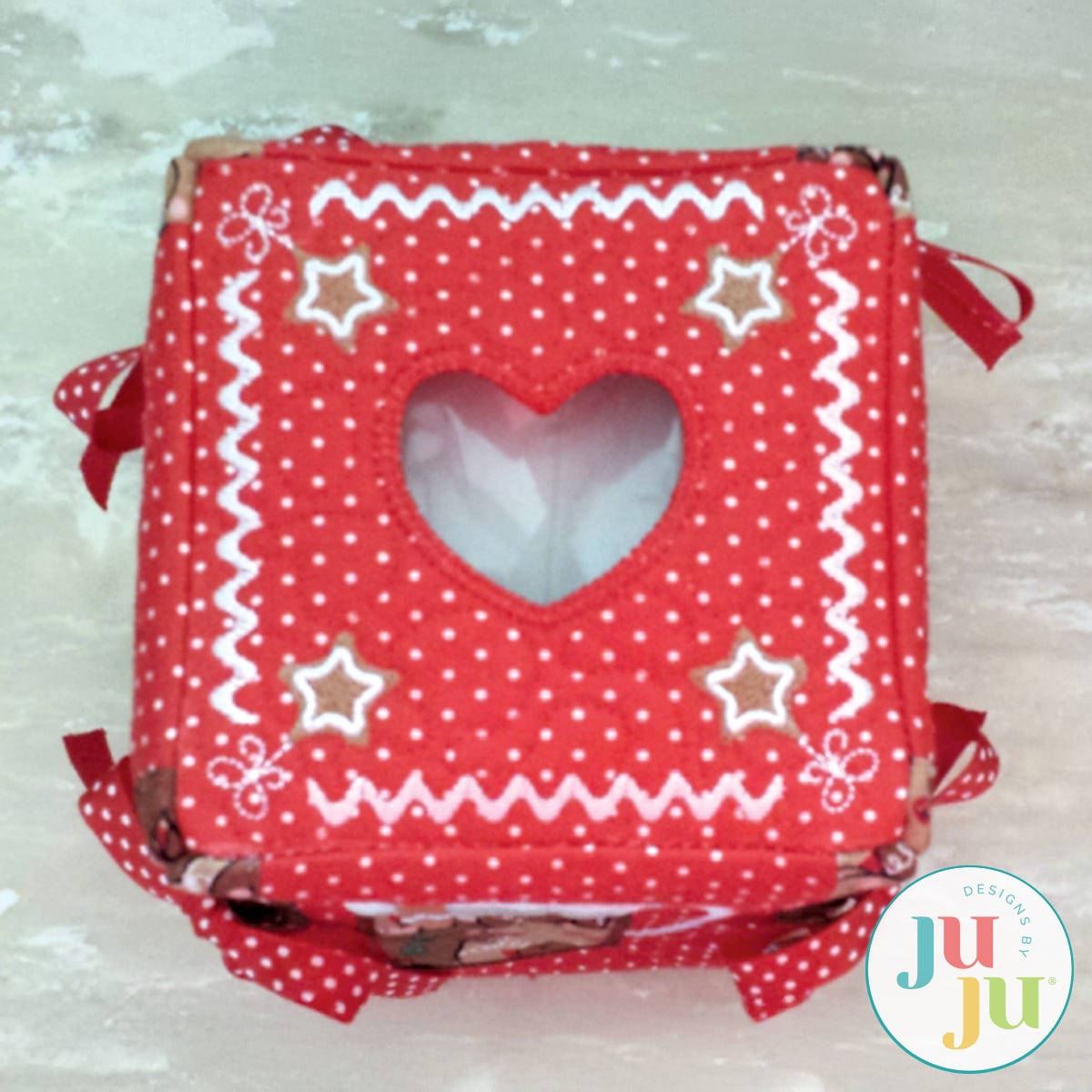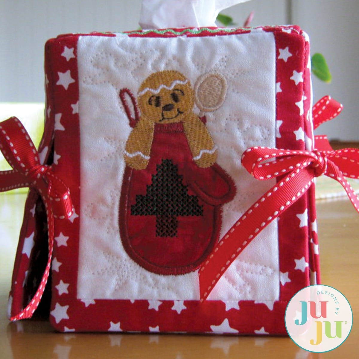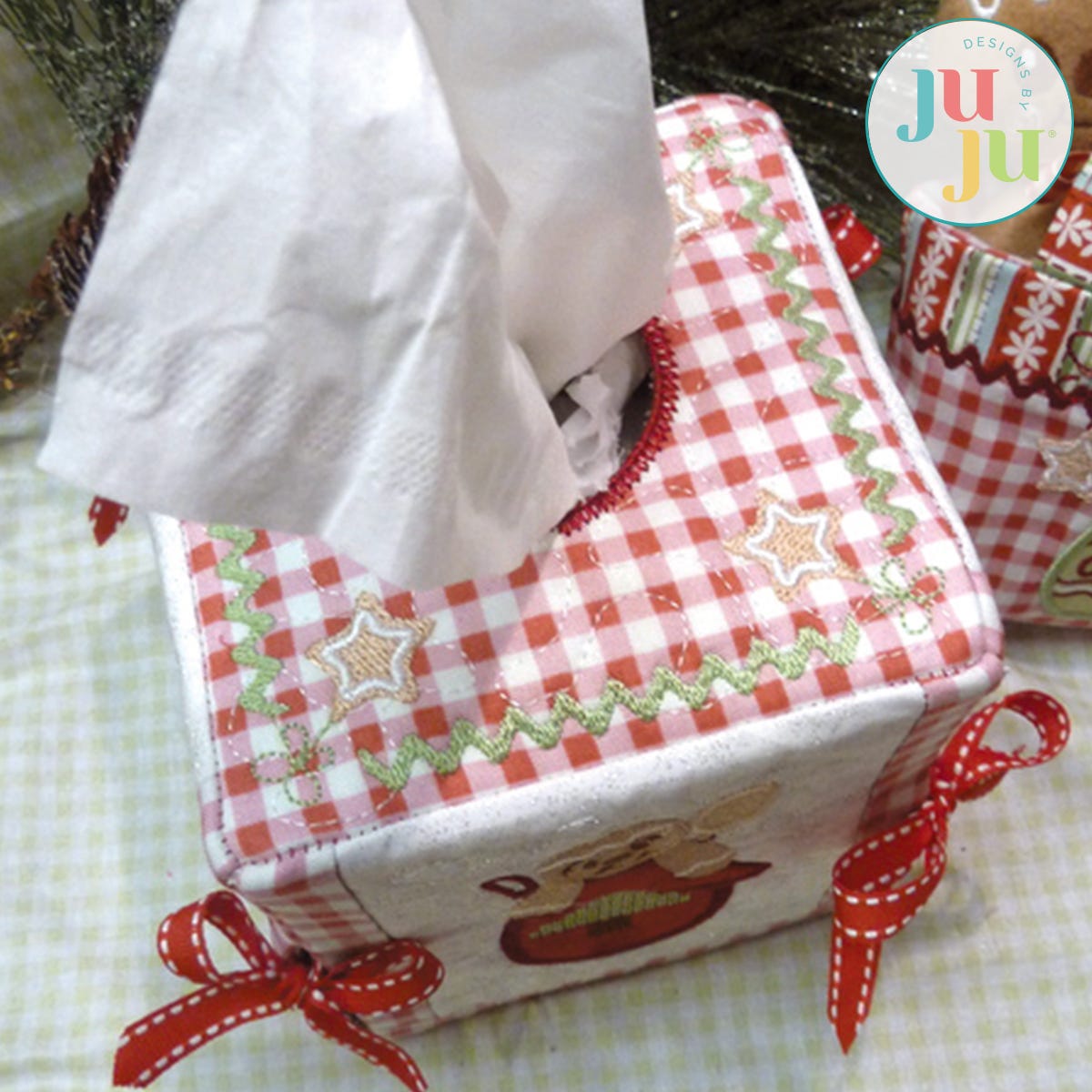 This tissue box cover will add a touch of whimsy to your Christmas decorating. Each side and top is stipple quilted, lined, and pieced together in the hoop. Ribbons tied at the sides further enhance the whimsical feel. There is a small amount of hand sewing required. The tissue box size used for this cover is approximately 4.5" x 4.5" x 5" tall. Files include a top and three sides - Side 4 is a repeat of side 2.