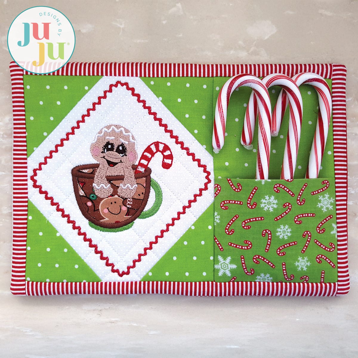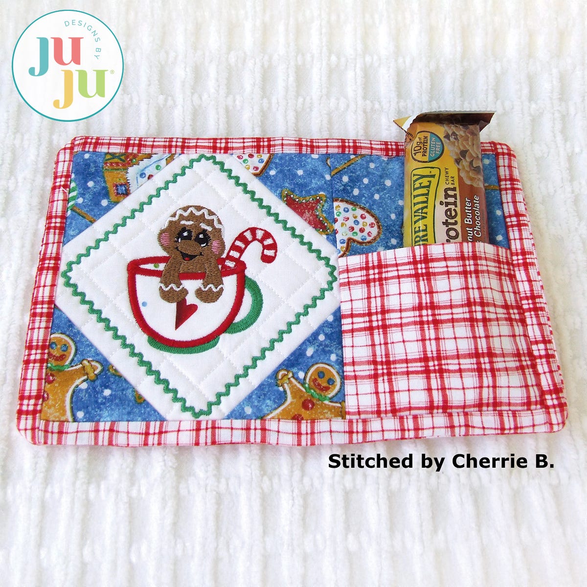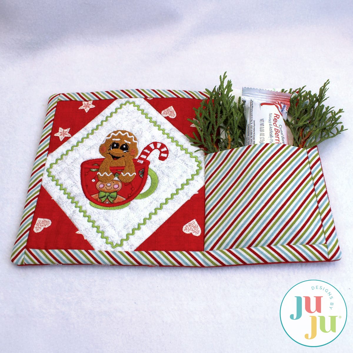 This in the hoop snack mat is entirely constructed in the hoop. No machine or handsewing required. There are geometrical quilting stitches behind the gingerbread and the pieced corners are applied as part of your embroidery. The faux binding is also done in the hoop with the stitch ‘n flip method. On the right side of the snackmat is an optional pocket to hold silverware or a small treat. Thorough and detailed instructions as well as many photos guide you through the process of making these. You will receive the snack mat with the gingerbread design; the gingerbread design by itself; and, finally, a plain snack mat for you to insert a design of your own choosing.
