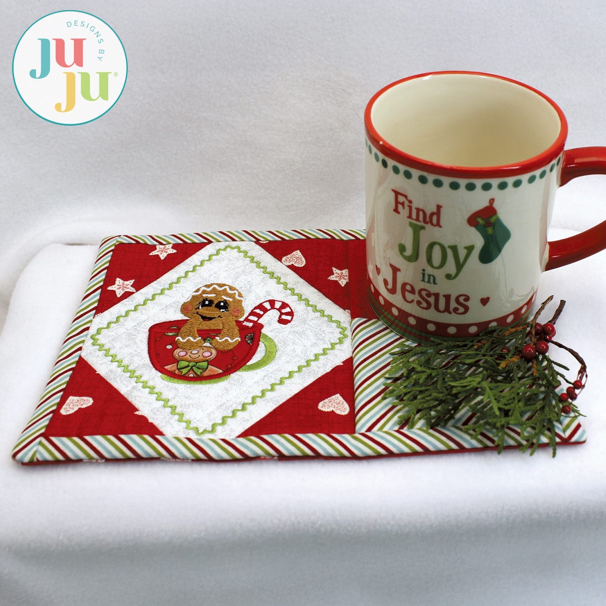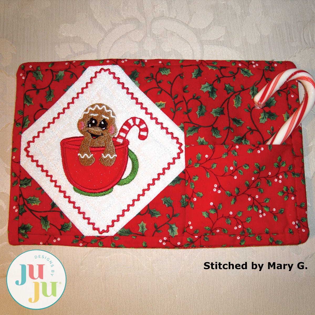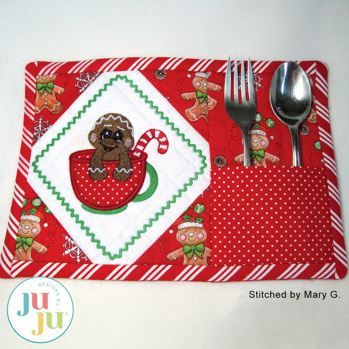 This in the hoop snack mat is entirely constructed in the hoop. No machine or handsewing required. There are geometrical quilting stitches behind the gingerbread and the pieced corners are applied as part of your embroidery. The faux binding is also done in the hoop with the stitch ‘n flip method. On the right side of the snackmat is an optional pocket to hold silverware or a small treat. Thorough and detailed instructions as well as many photos guide you through the process of making these. You will receive the snack mat with the gingerbread design; the gingerbread design by itself; and, finally, a plain snack mat for you to insert a design of your own choosing.