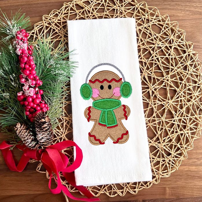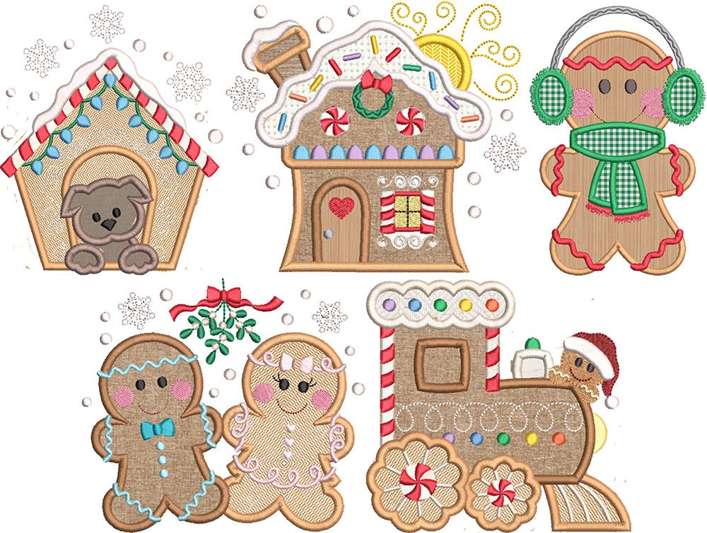 Five adorable gingerbread applique designs! The set includes a gingerbread house, gingerbread train, gingerbread couple, gingerbread man bundled for winter weather, and a gingerbread doghouse.