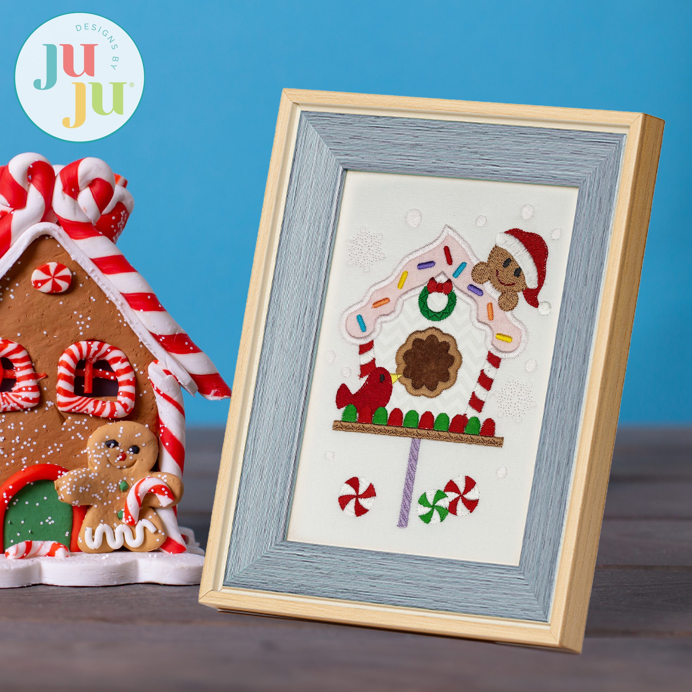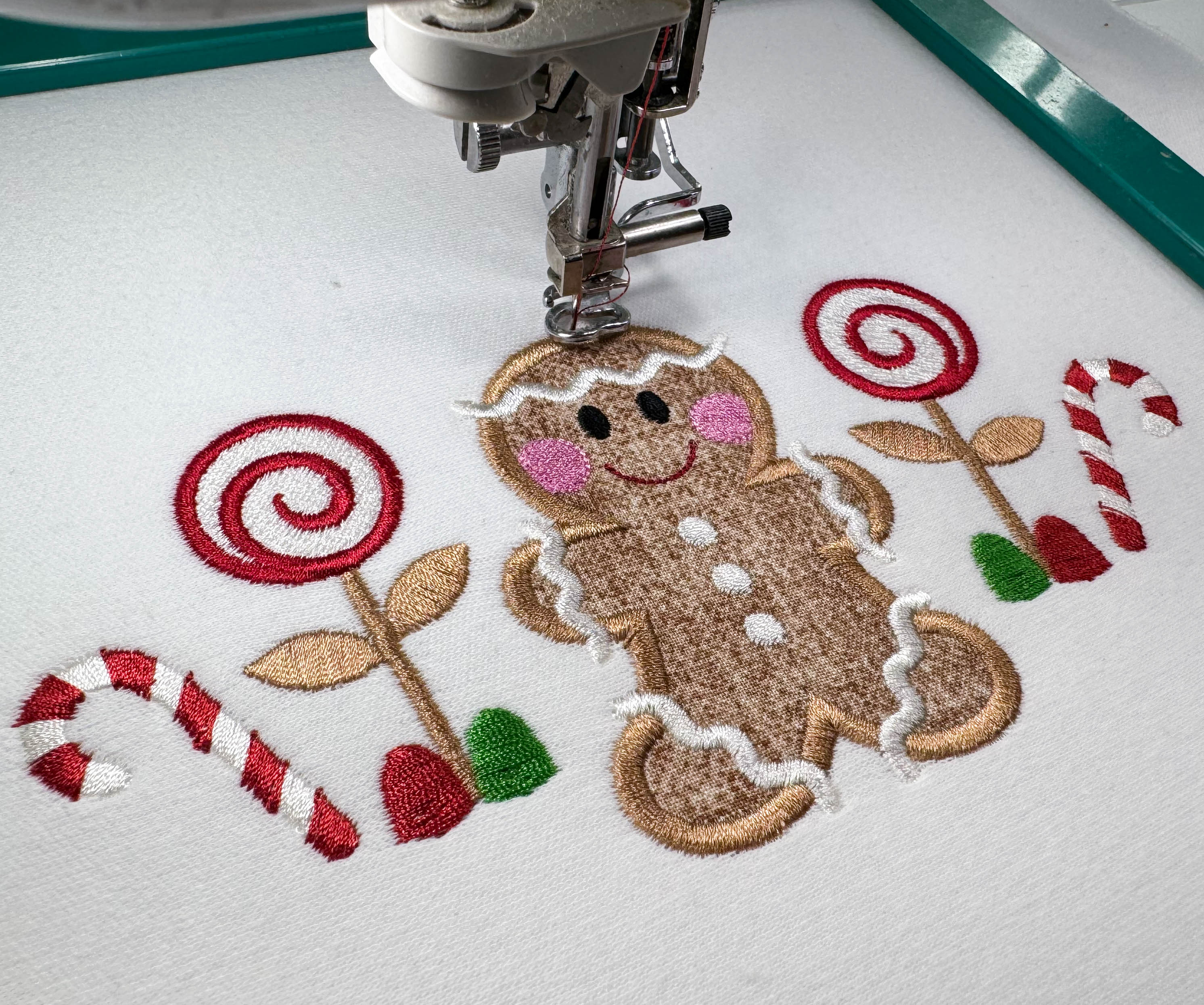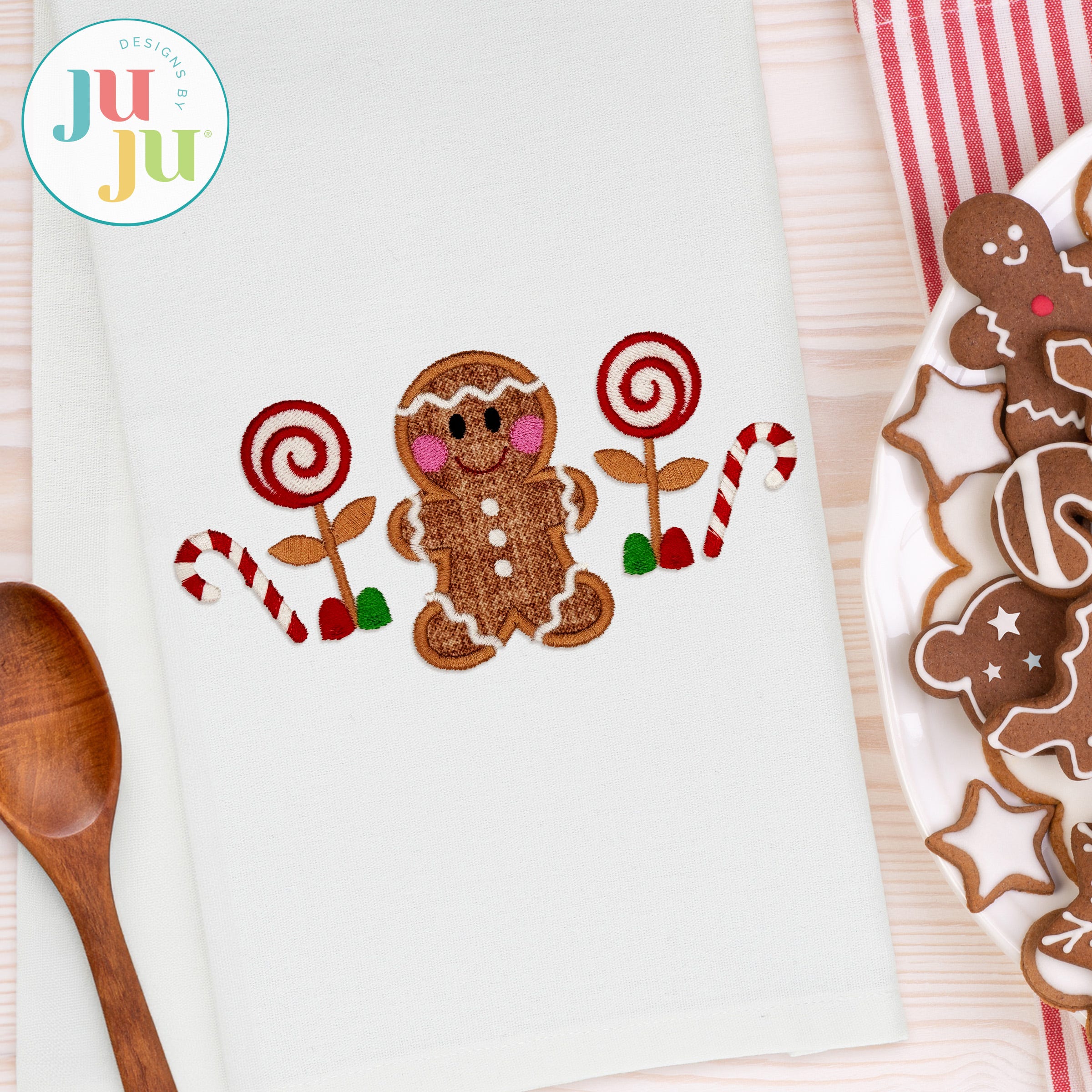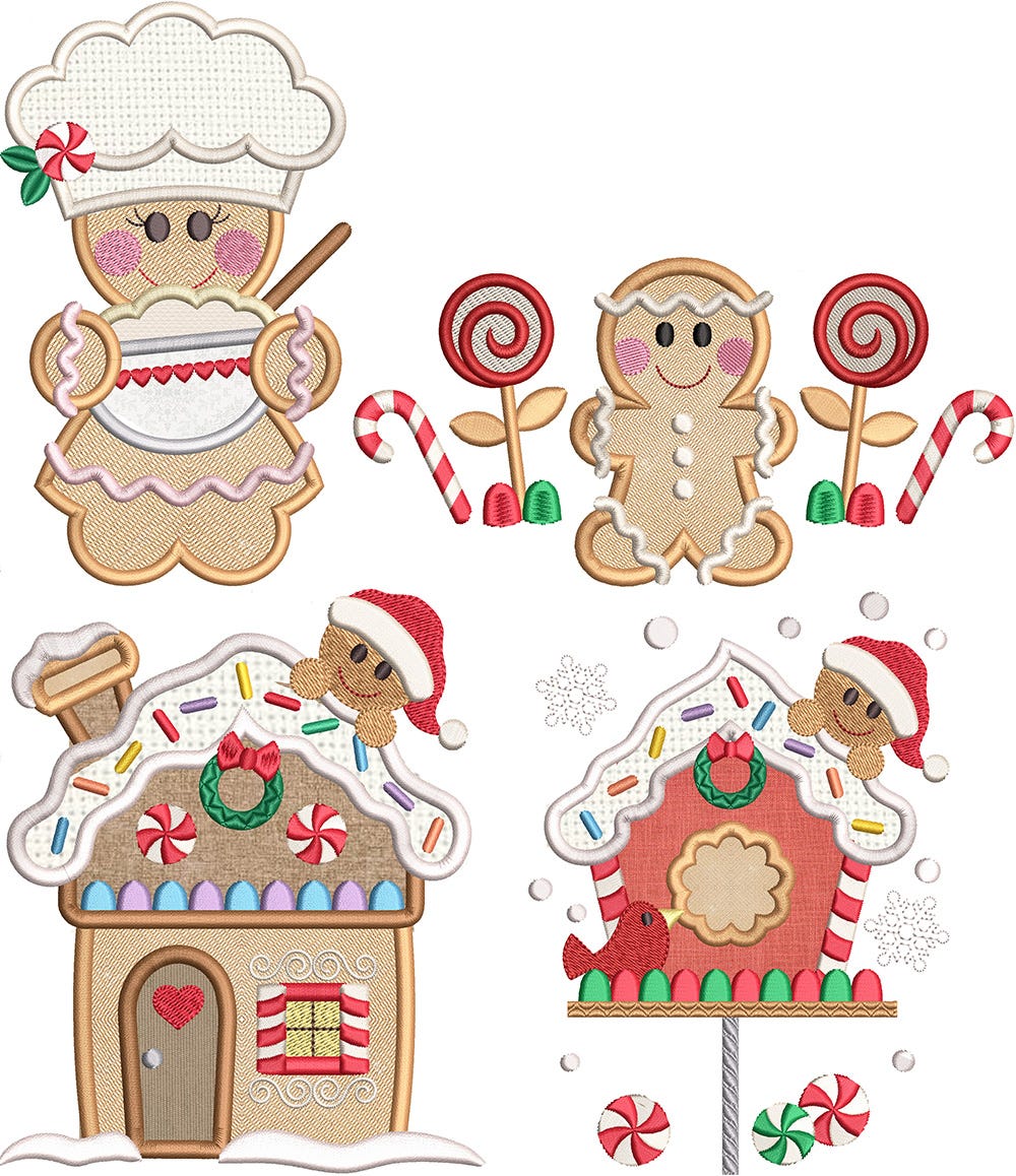 Four more adorable gingerbread applique designs! This set includes a gingerbread baker, gingerbread house, gingerbread birdhouse, and gingerbread with candy.