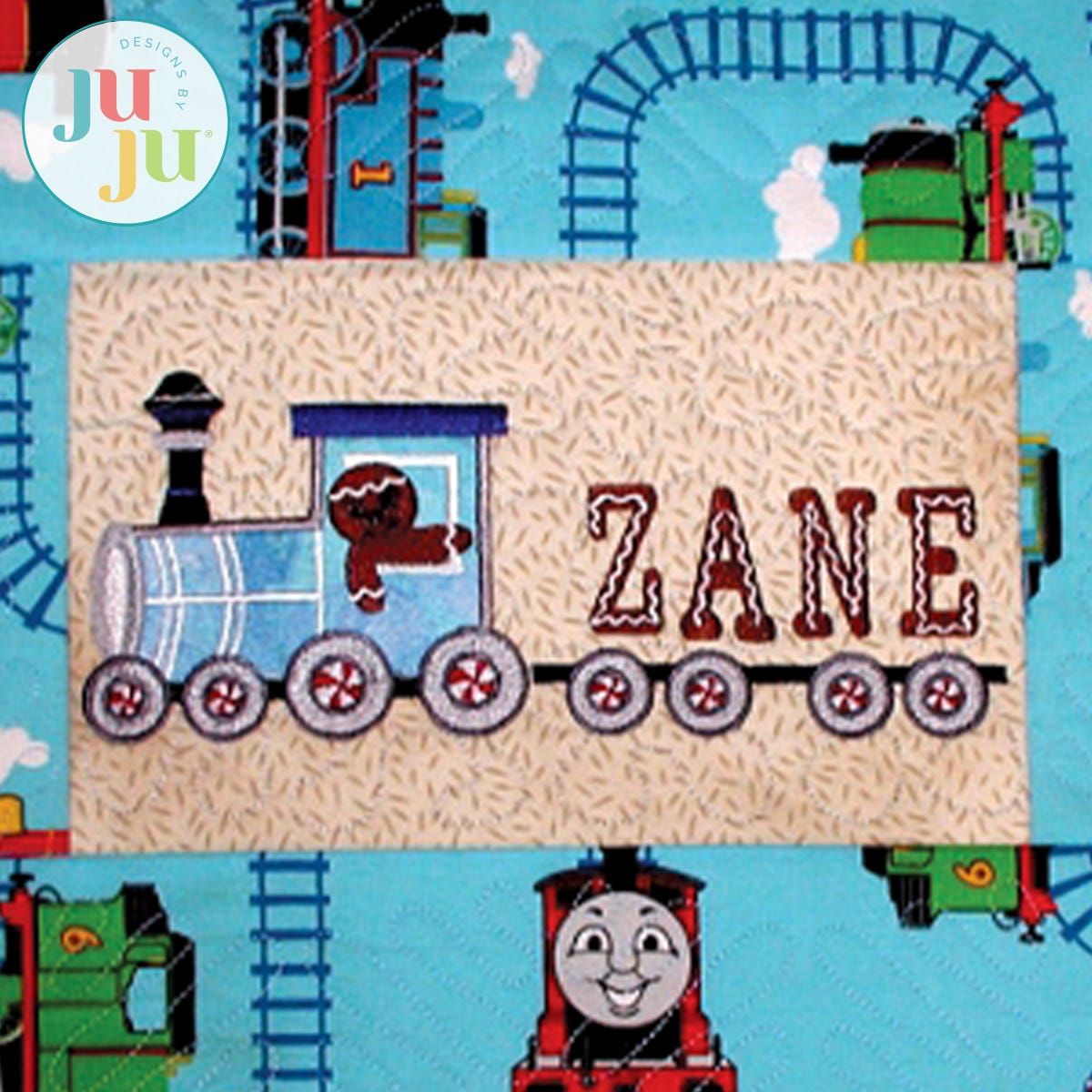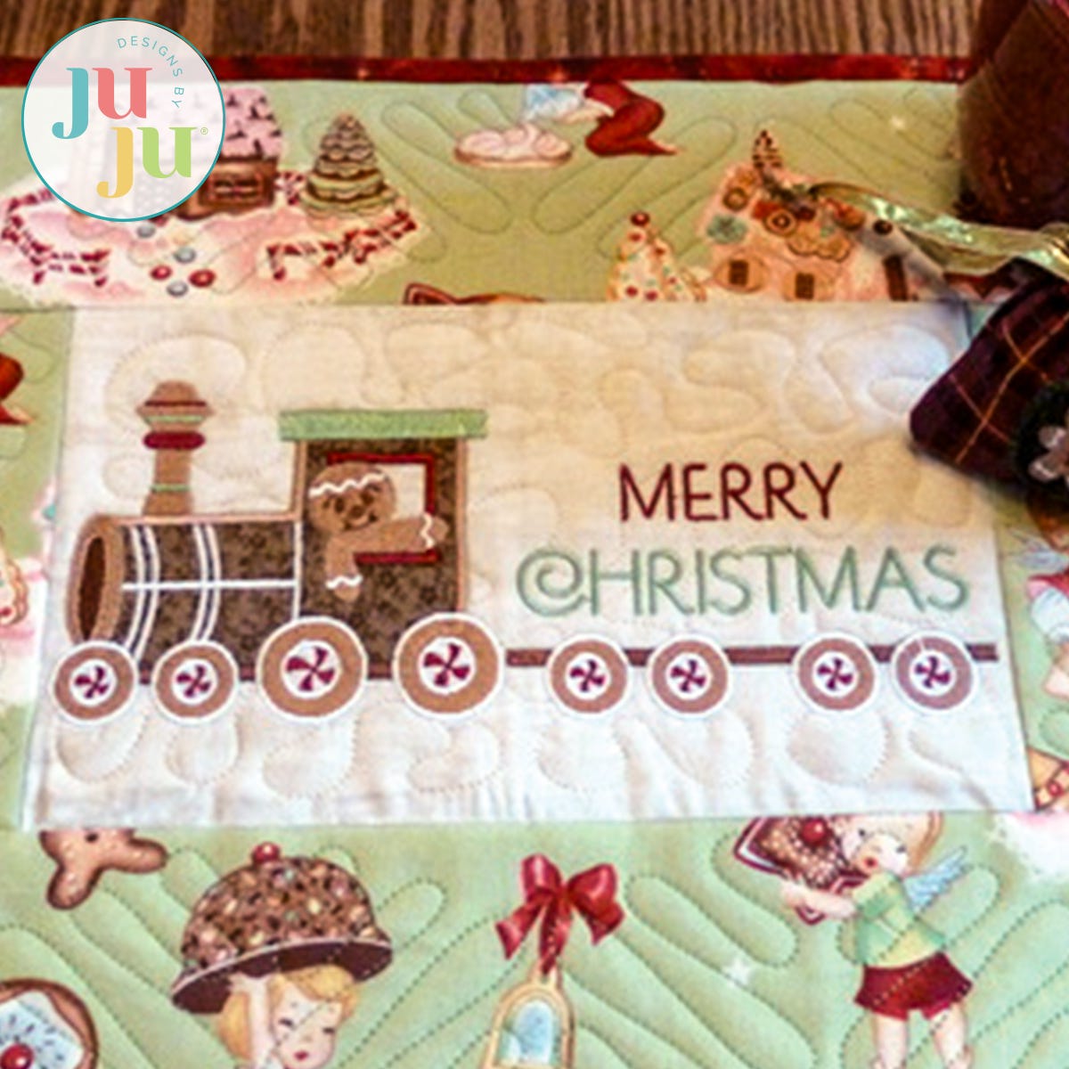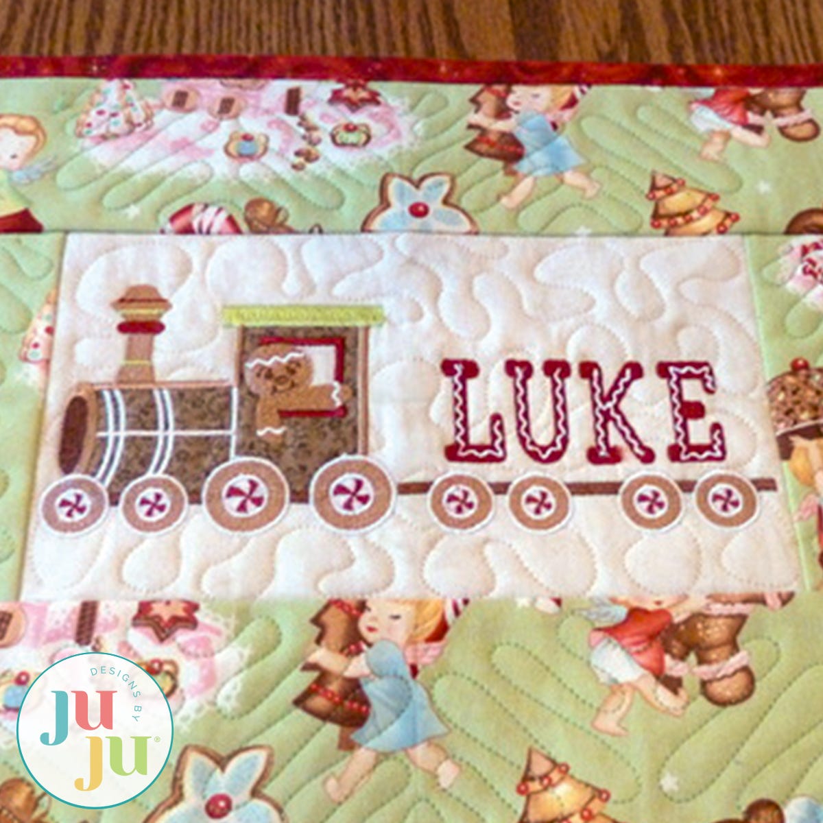 This applique train design is from our Gingerbread Train Placemat set. There are two designs included with your purchase: the gingerbread train with the empty car. You can place any wording of your choice over this area from: Merry Christmas; to Santa please stop here, to a child's name or inspirational words like Peace, Hope, etc.