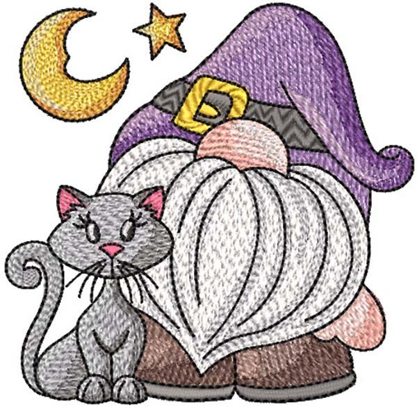 This gnome and his cat are ready for a spooky Halloween night! 4x4 and 5x7 hoop sizes included. This single design