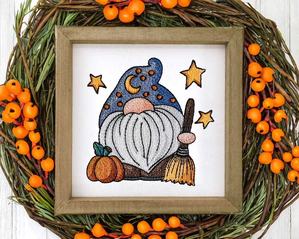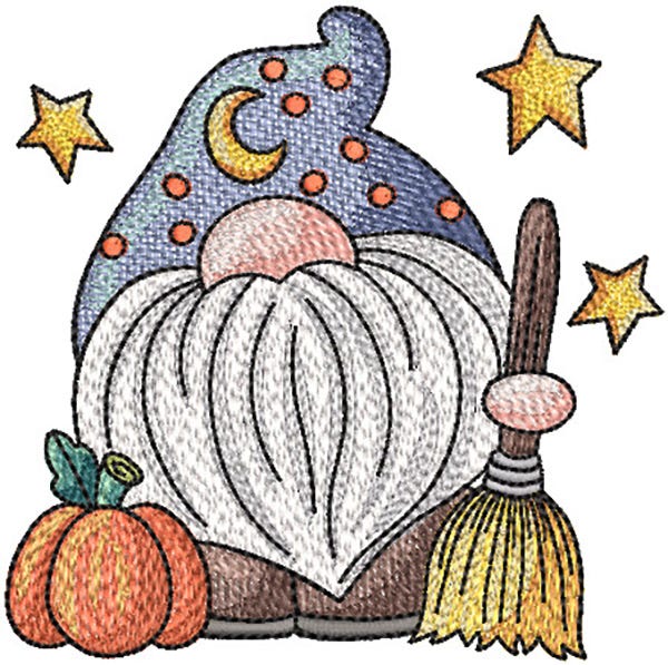 This gnome wizard is ready to cast a Halloween spell! 4x4 and 5x7 hoop sizes included. This single design features multiple color layers of lighter density fill to create a blended, variegated, textured look.