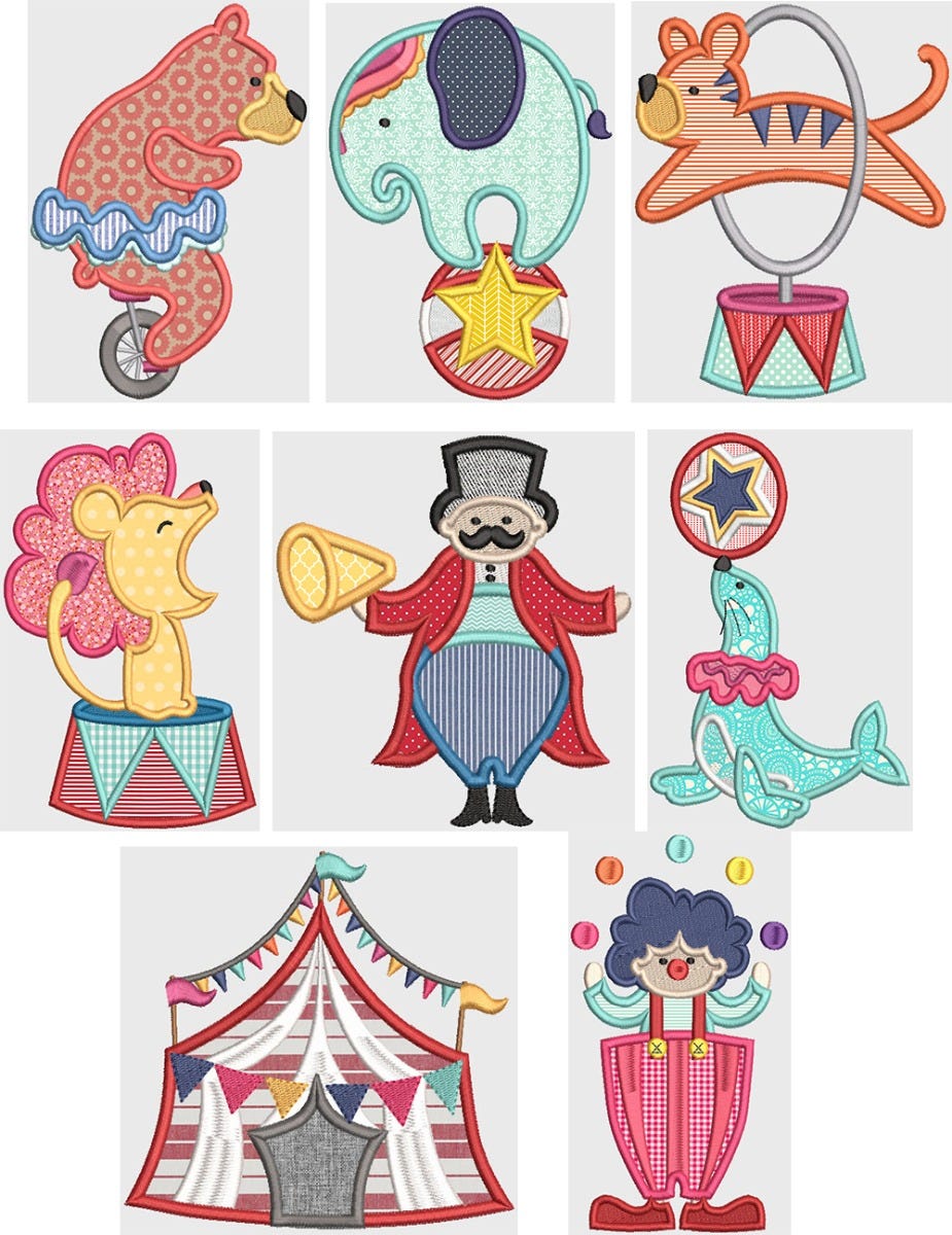 8 adorably fun circus inspired applique designs!