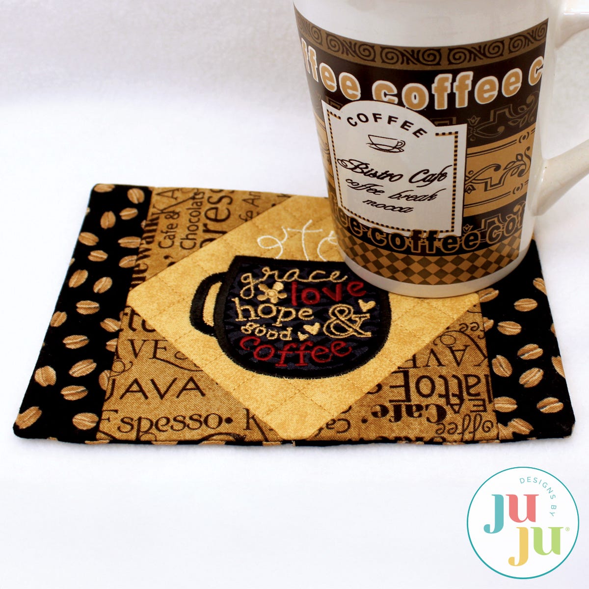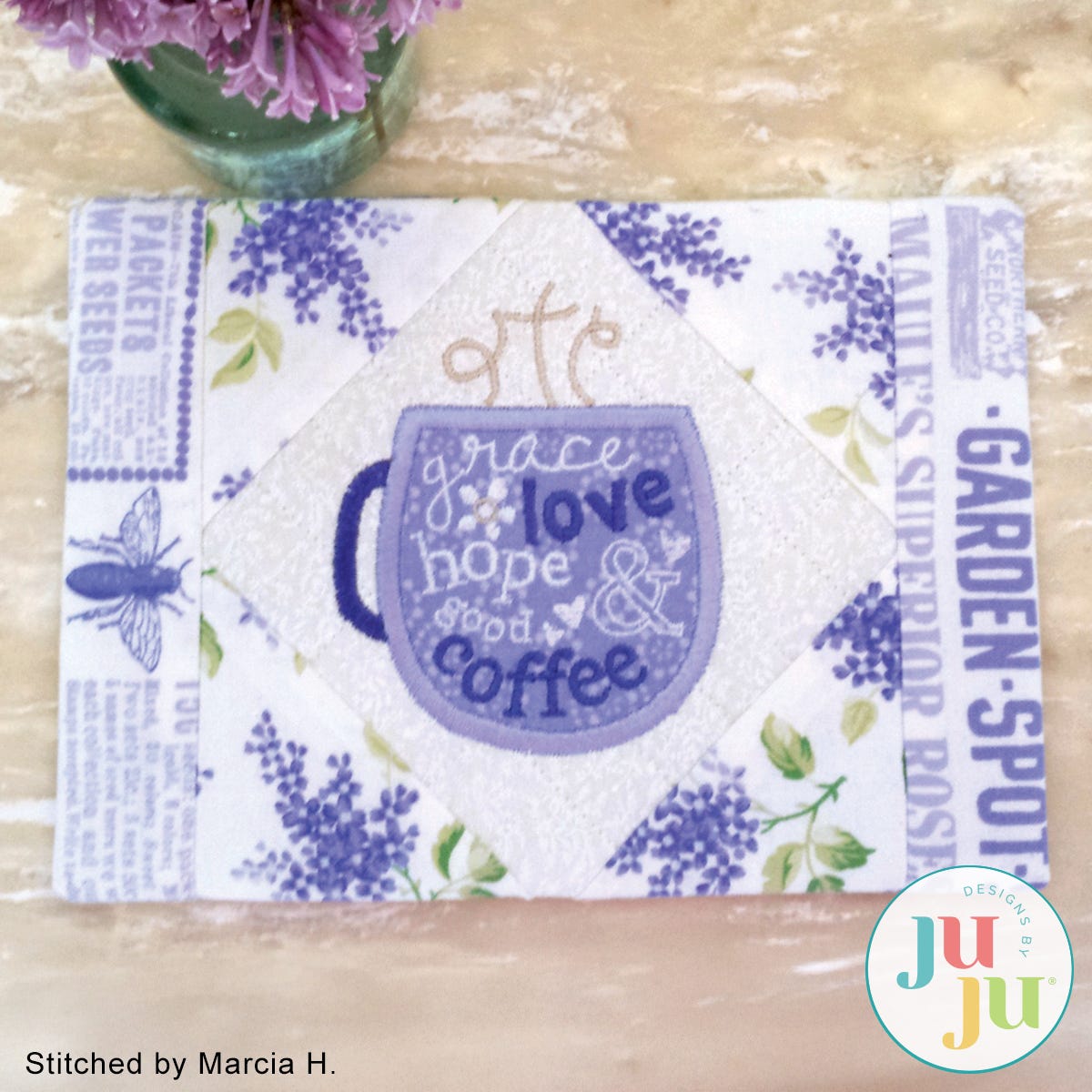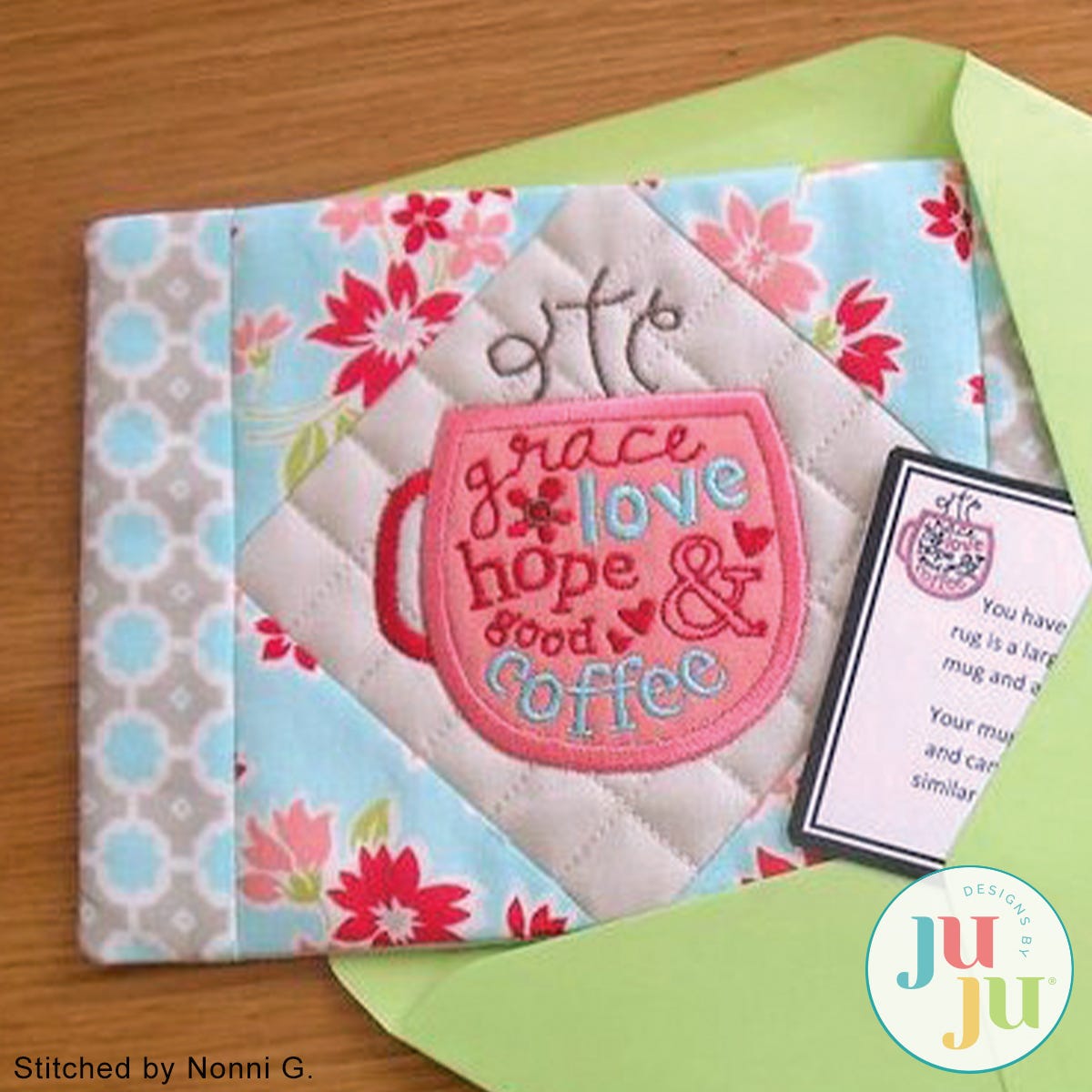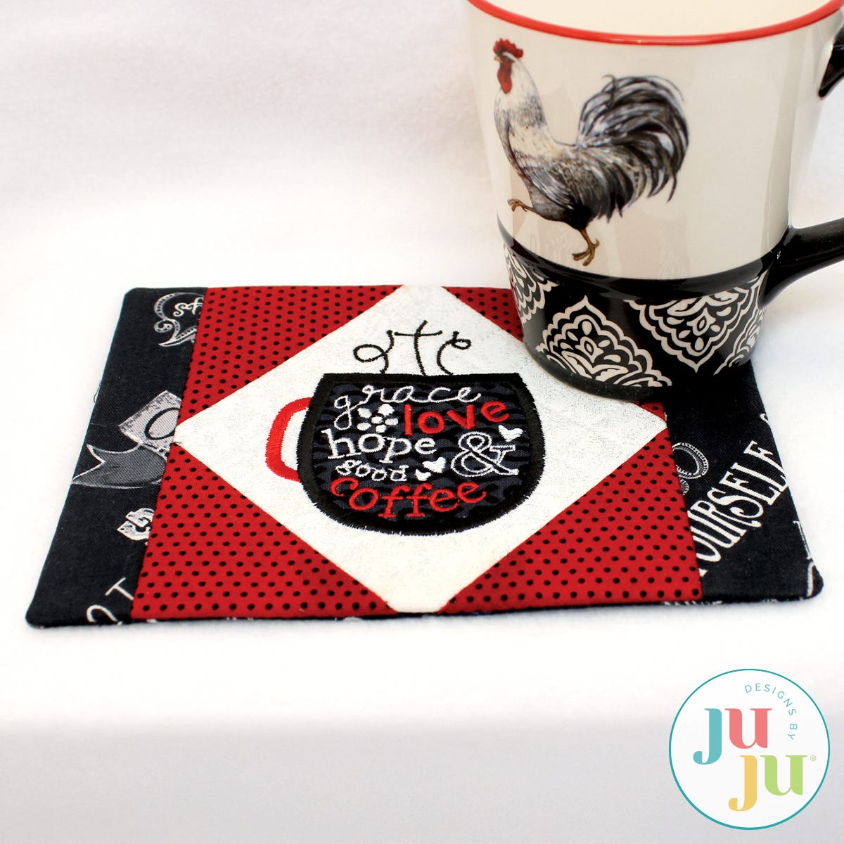 This mug rug is entirely constructed in the hoop, the quilting stitches are geometrical and the pieced corners and border strips are applied during the applique process. Thorough and detailed instructions as well as many photos guide you through the process of making these. Also included in your zip is a plain mug rug, without the center design, for you to showcase a special fabric of your choosing. There are a total of 2 stitch files in your download. No hand or machine sewing required. You will also find a guide to fabric selection for this mug rug.