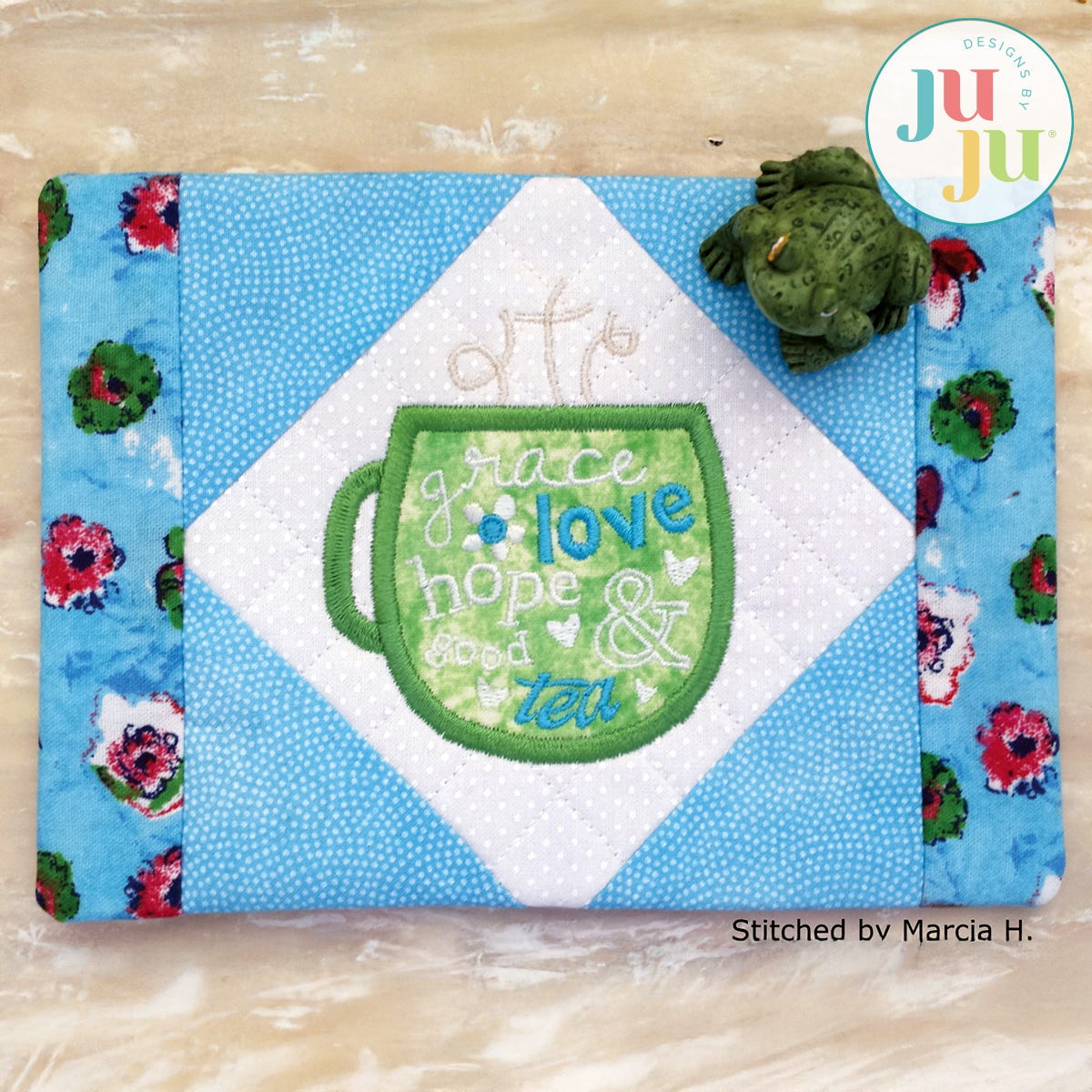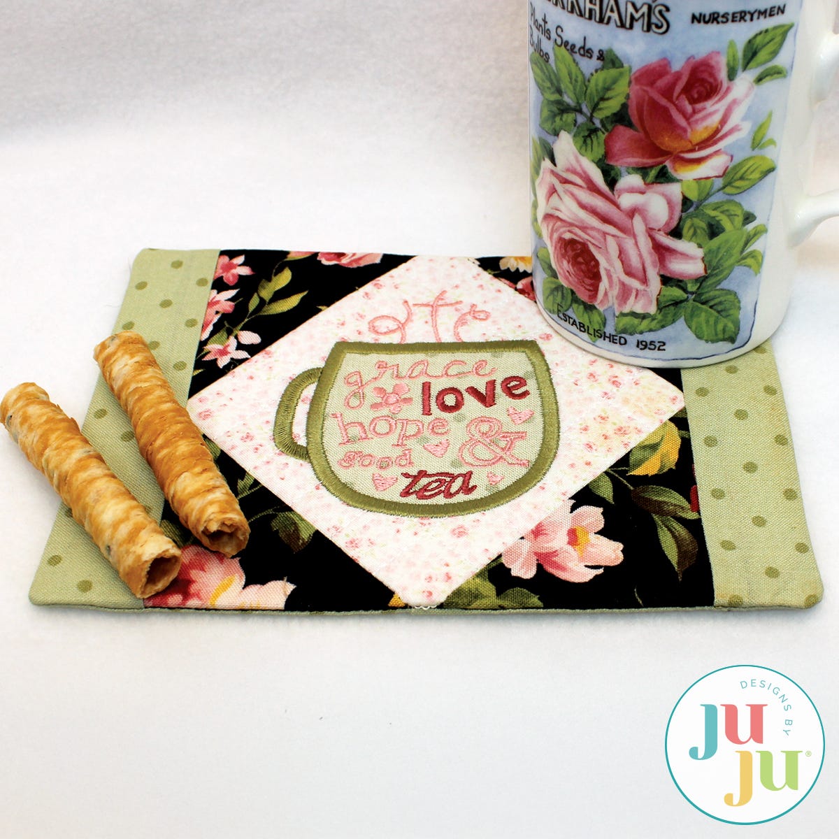 This mug rug is entirely constructed in the hoop, the quilting stitches are geometrical and the pieced corners and border strips are applied during the applique process. Thorough and detailed instructions as well as many photos guide you through the process of making these. Also included in your zip is a plain mug rug, without the center design, for you to showcase a special fabric of your choosing. There are a total of 2 stitch files in your download. No hand or machine sewing required. You will also find a guide to fabric selection for this mug rug.