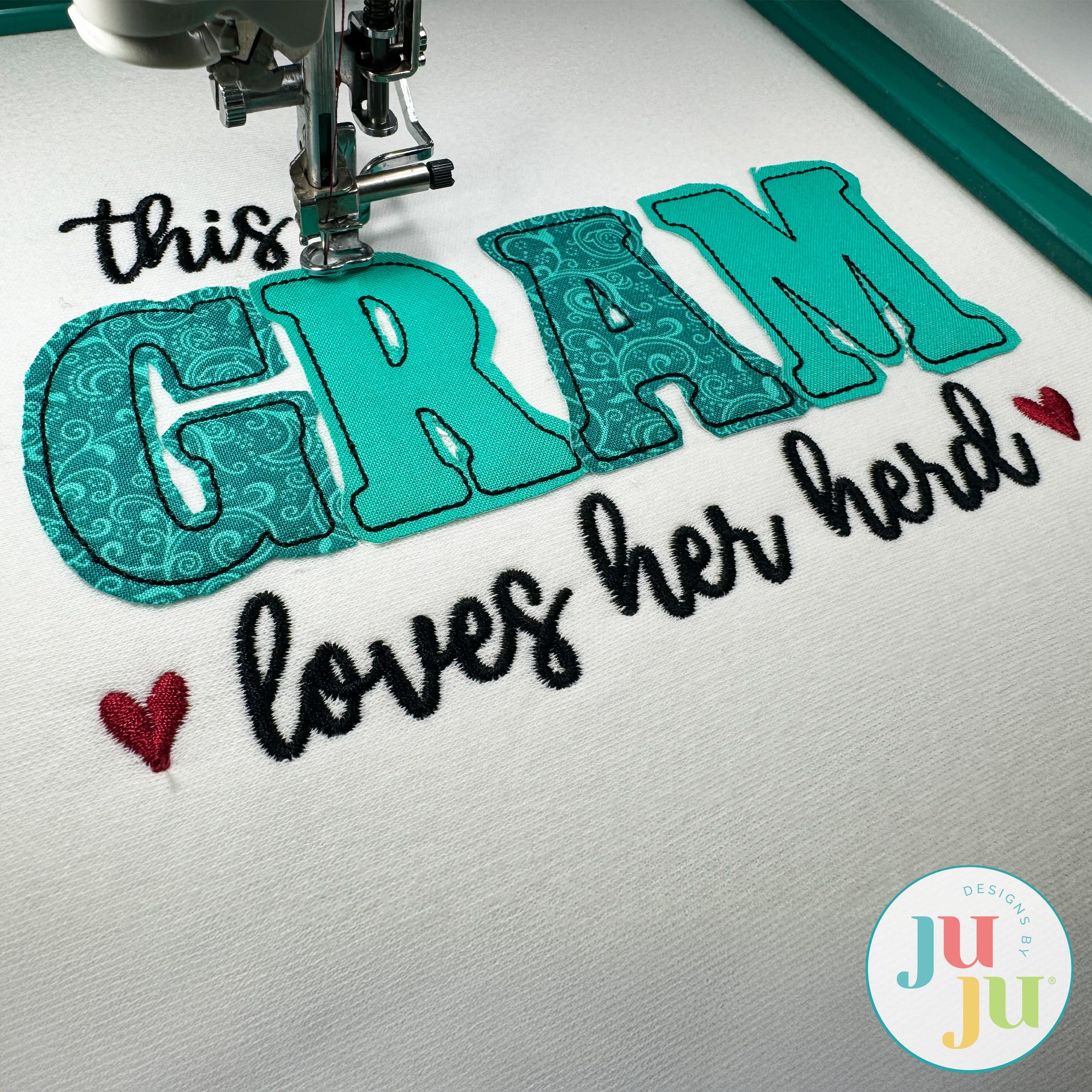 This Gram Loves Her Herd! The design set includes one applique in four sizes (4x4, 5x7, 6x10 and 8x8), plus two fill stitch Mini Highland Cows that can be used to customize your project. Add the number of boy and/or girl minis to represent your herd. Place them under the applique design or on the sleeve of a shirt; personalize with the font of your choice!