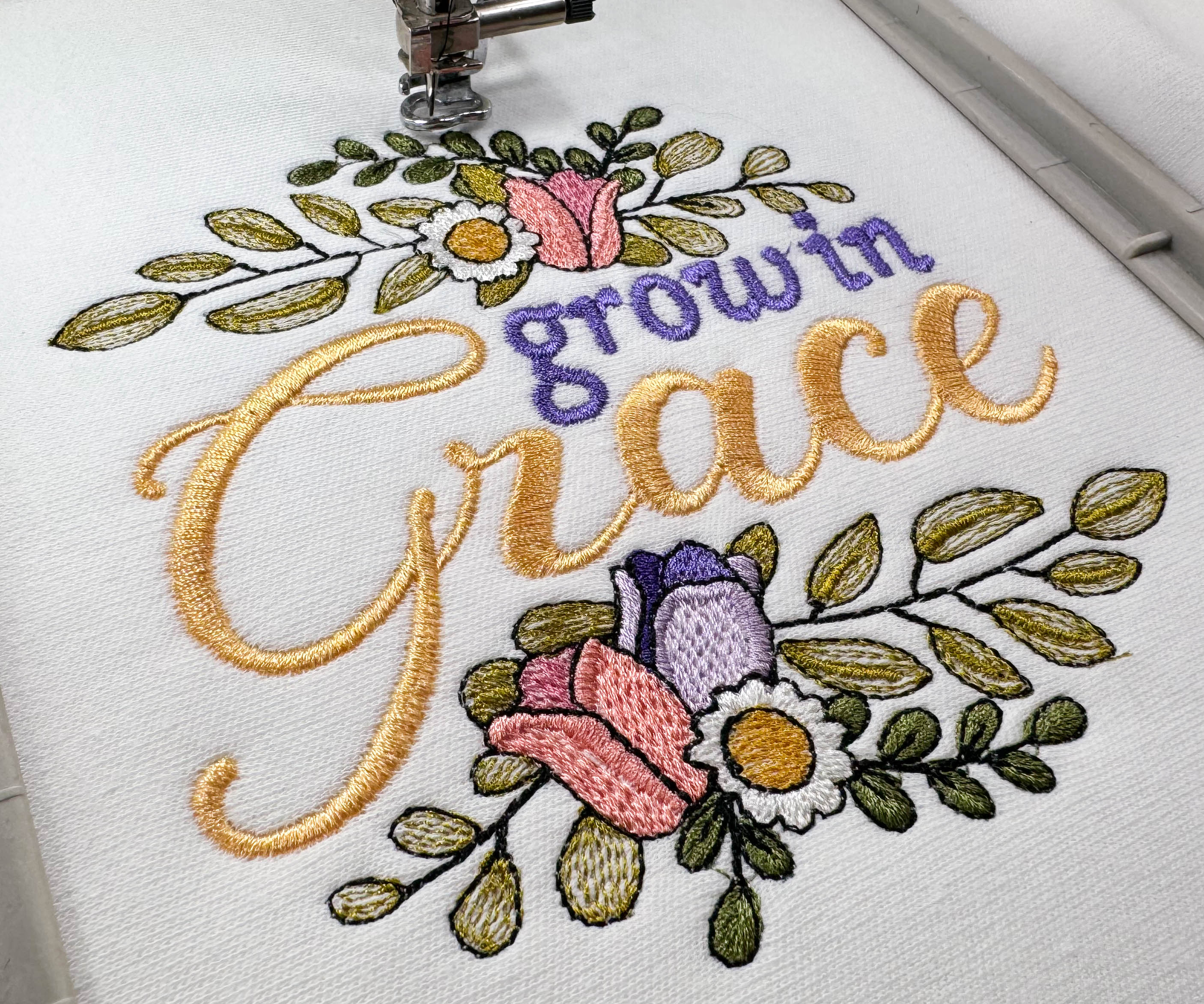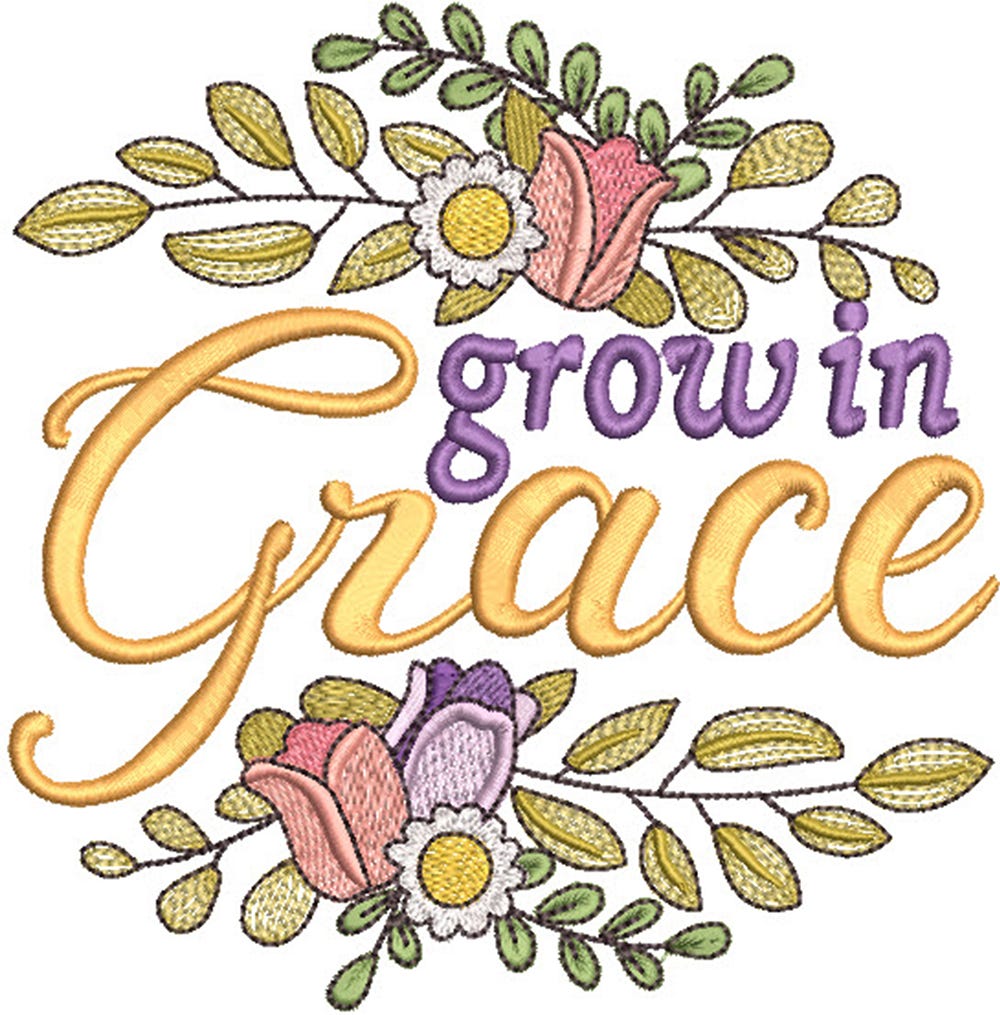Grow in Grace is a single embroidery-only design. The satin stitch lettering is inside a floral wreath featuring a blend of sketch and satin stitch fills with bean stitch outlines.