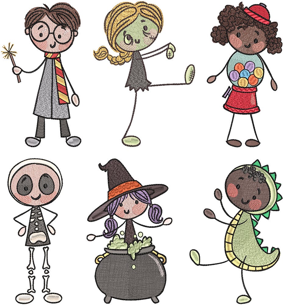 6 adorable Stix kids ready for Halloween! Embroidery-only with a mix of decorative fill stitch and satin stitch patterns to add texture.