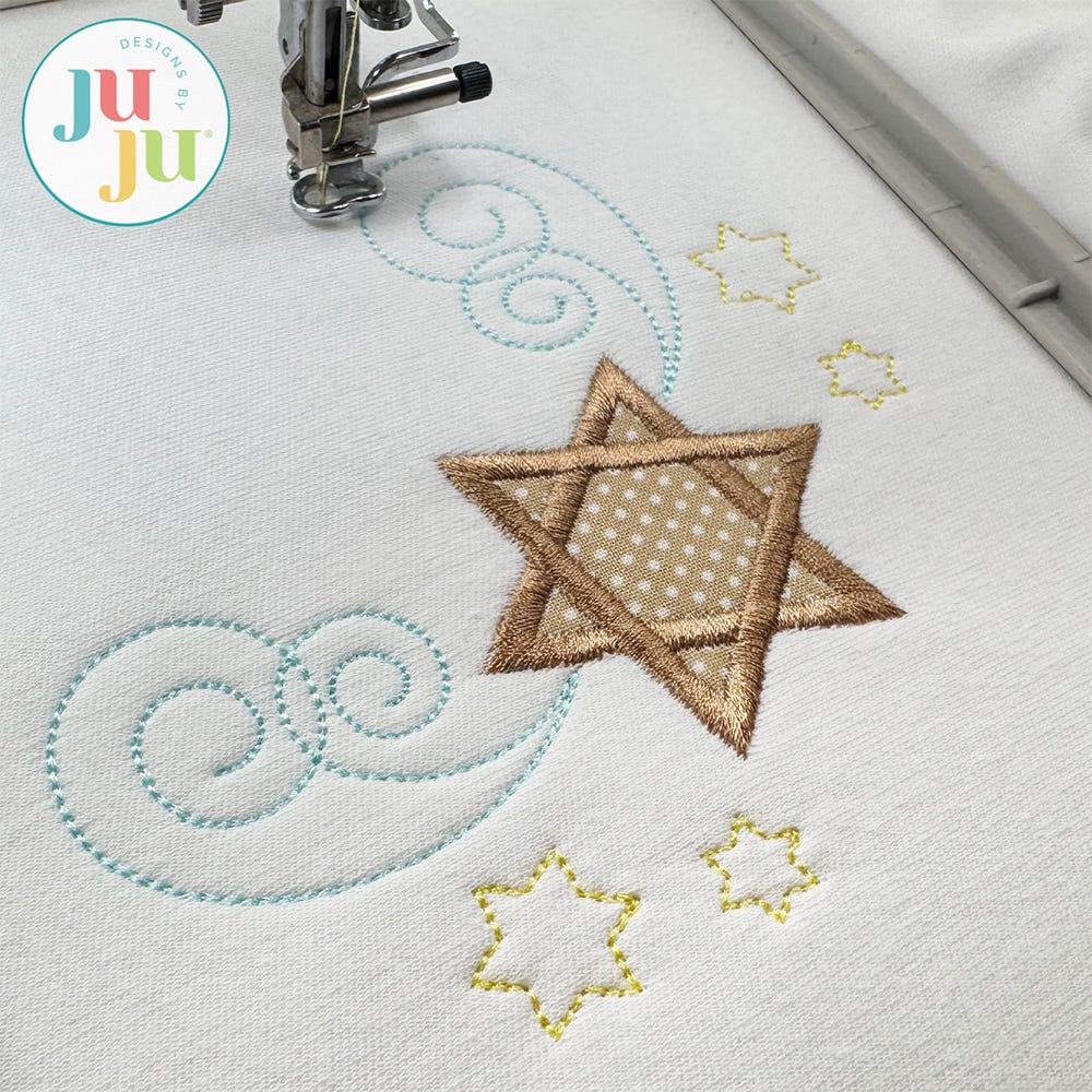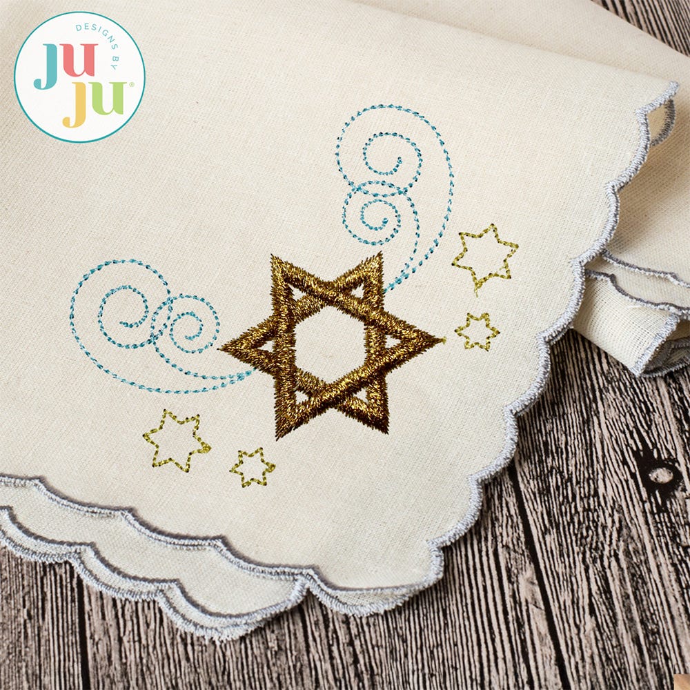 Celebrate the season of light with our Hanukkah Corner embroidery design! This elegant design features a beautiful applique Star of David with swirling accents and sparkling stars. The 4x4 size is designed to fit napkin corners.
