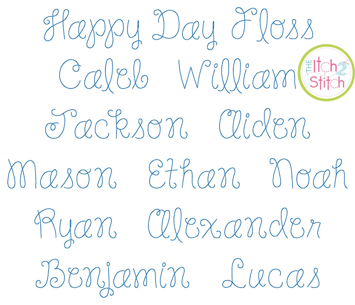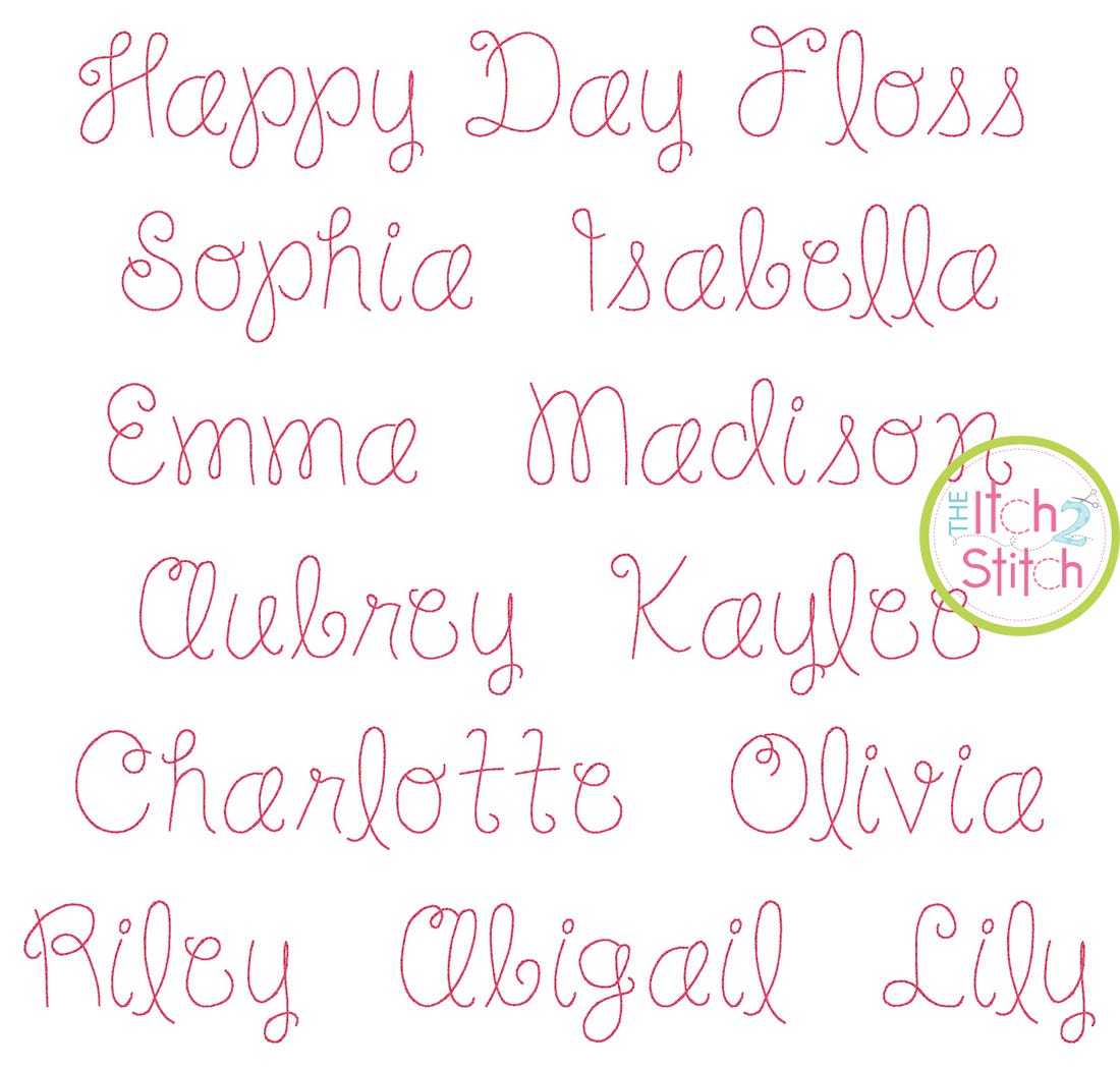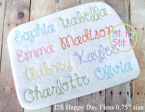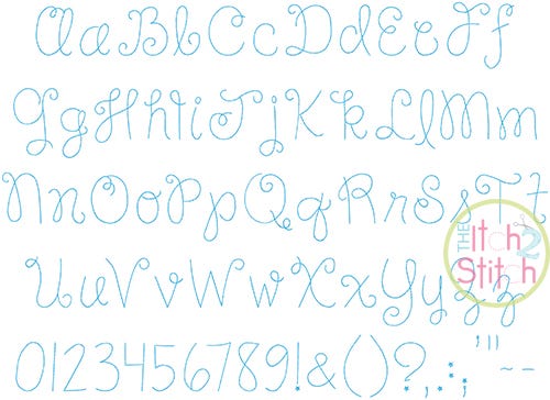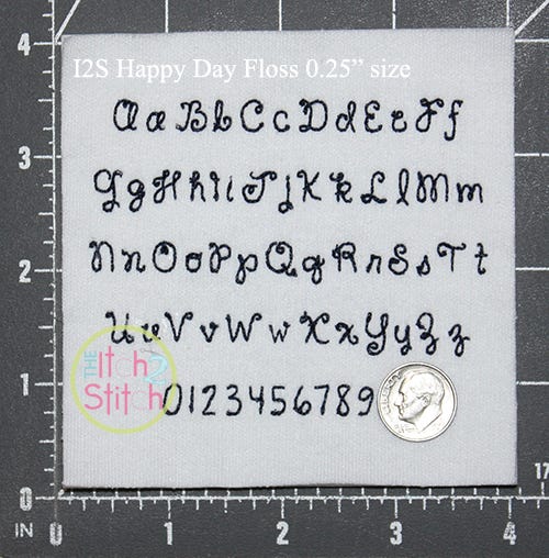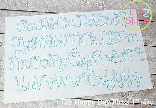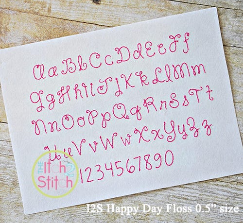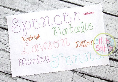The smallest sizes (1" and below) are a three-pass bean stitch font; the larger sizes (1.25" and above) are a three-pass backstitch font. Both originally designed to stitch on fabric, not card stock.