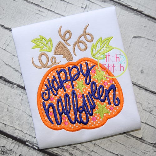 The text is included in the design file as pictured; applique pumpkin, fill stitch stem, open leaves