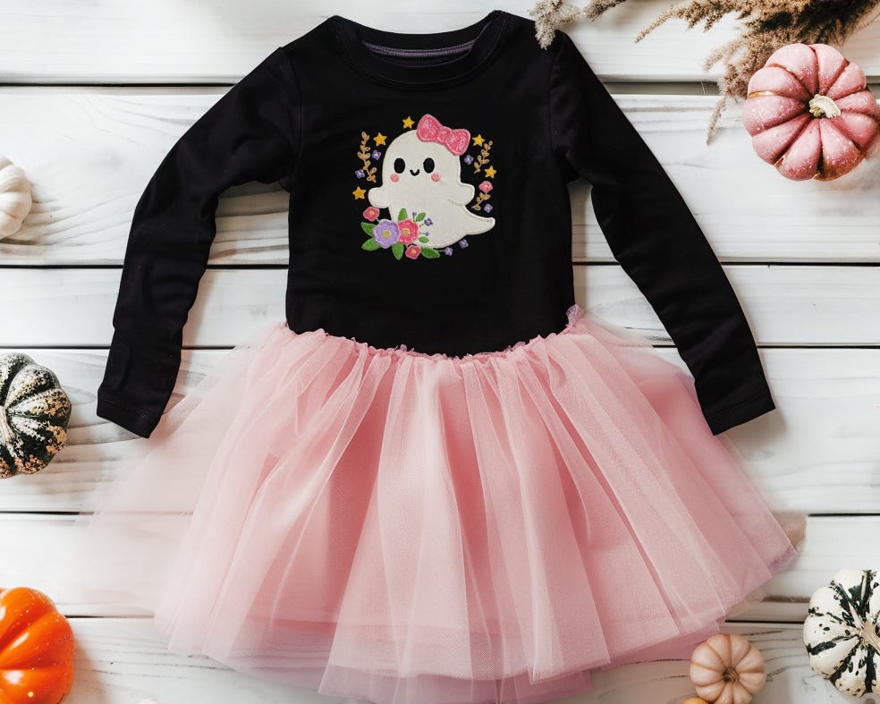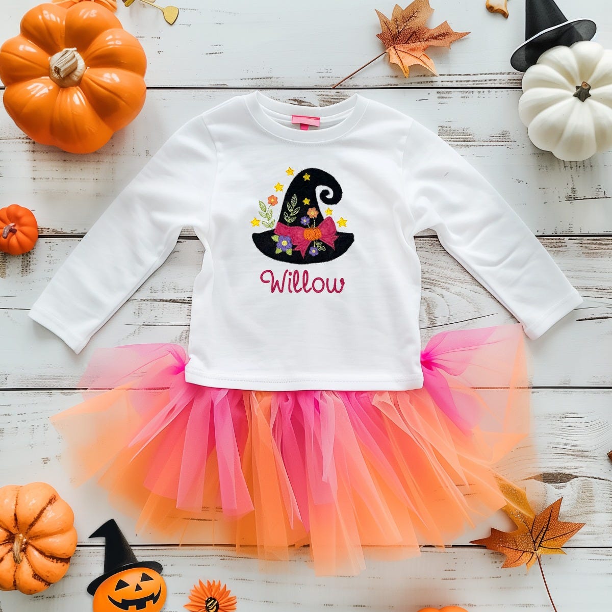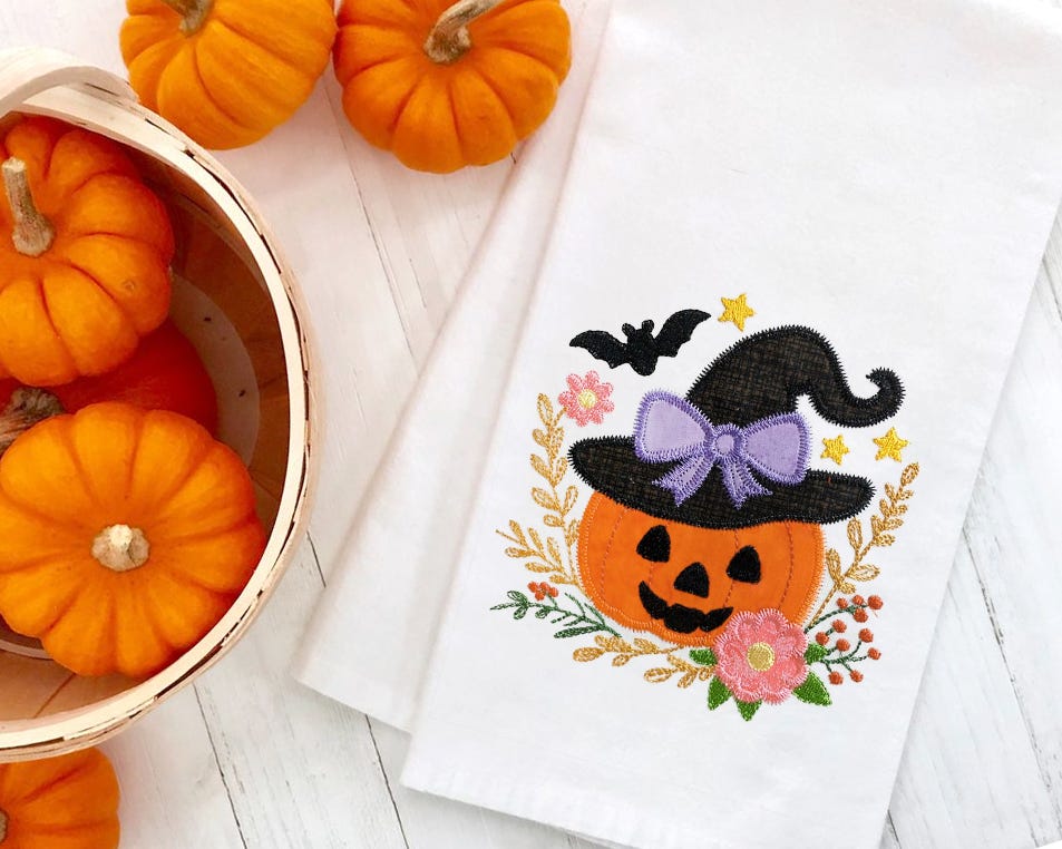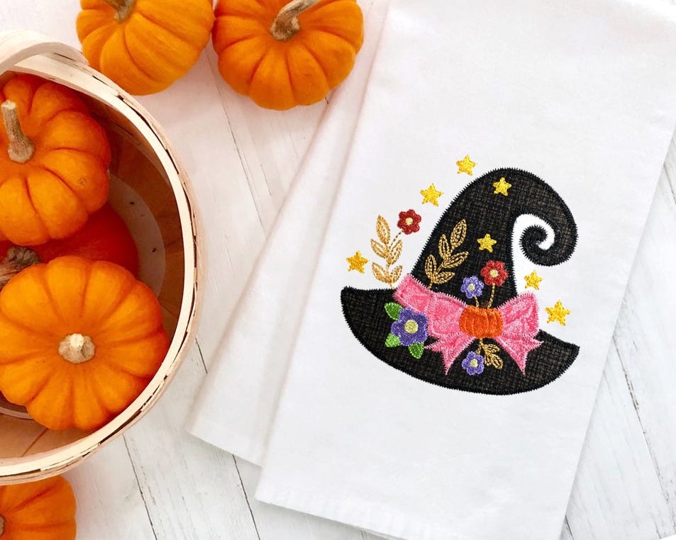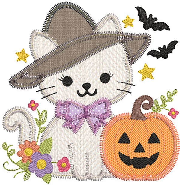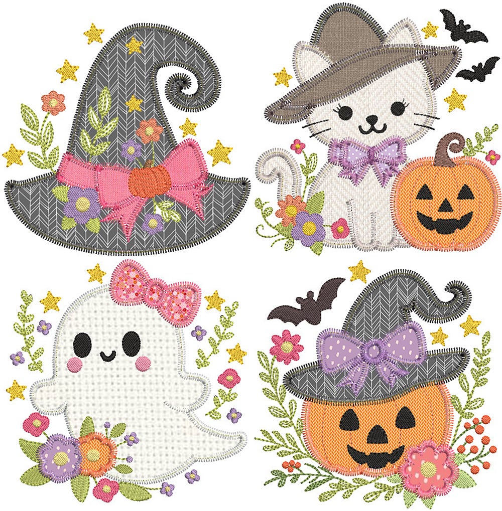 Four adorable Halloween themed applique designs: a sweet cat, ghost, jack-o-lantern and witch hat, all with a zig zag finish around the appliques.