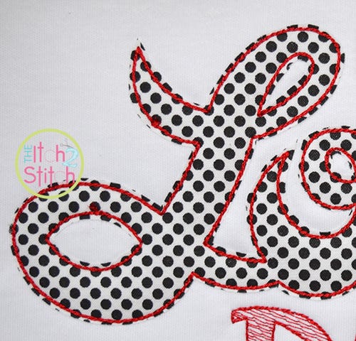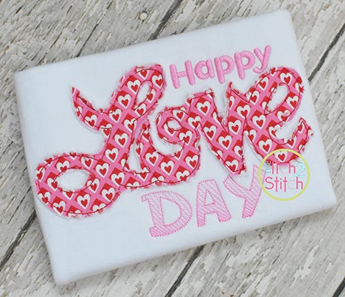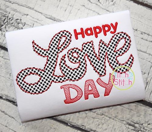 The word "Happy" is satin stitch. The word "Love" is applique finished in a bean stitch. The word DAY has a sketch fill pattern (light and airy).