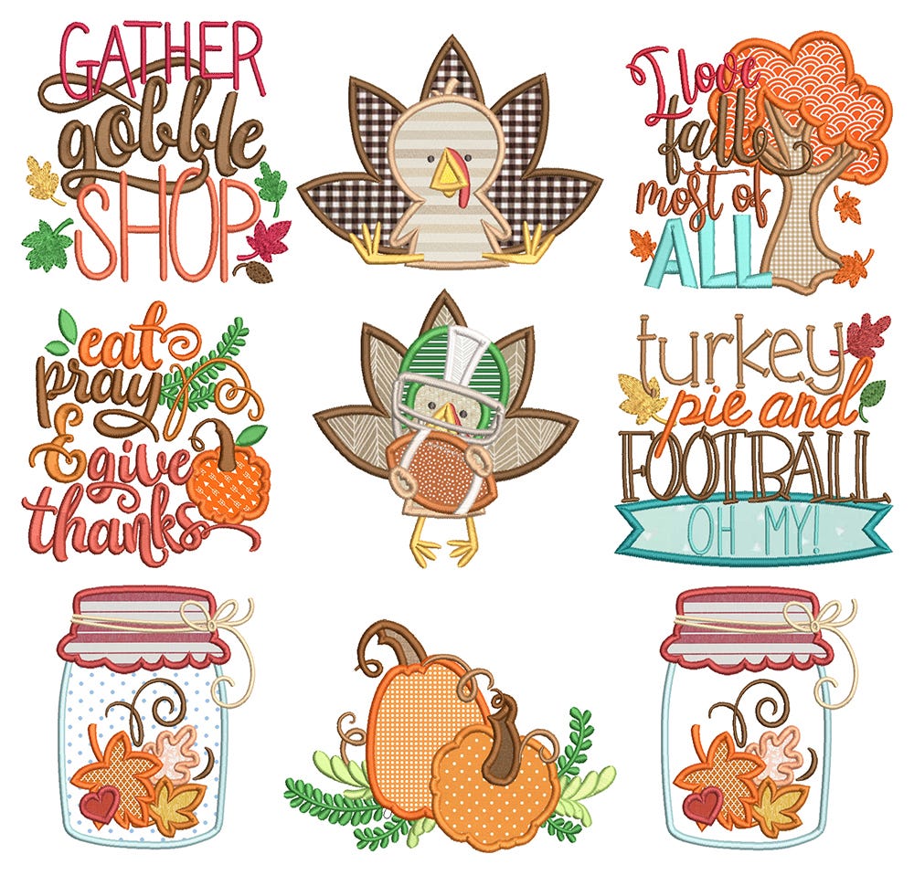 8 adorable harvest themed designs perfect for all your fall projects!Ā Please note most designs contain applique components.