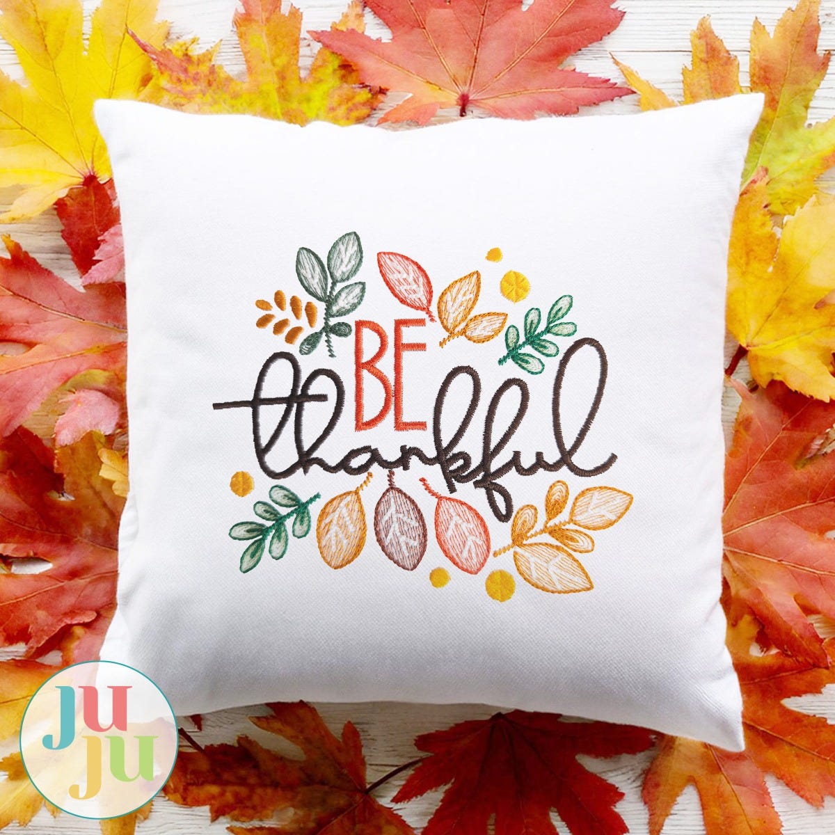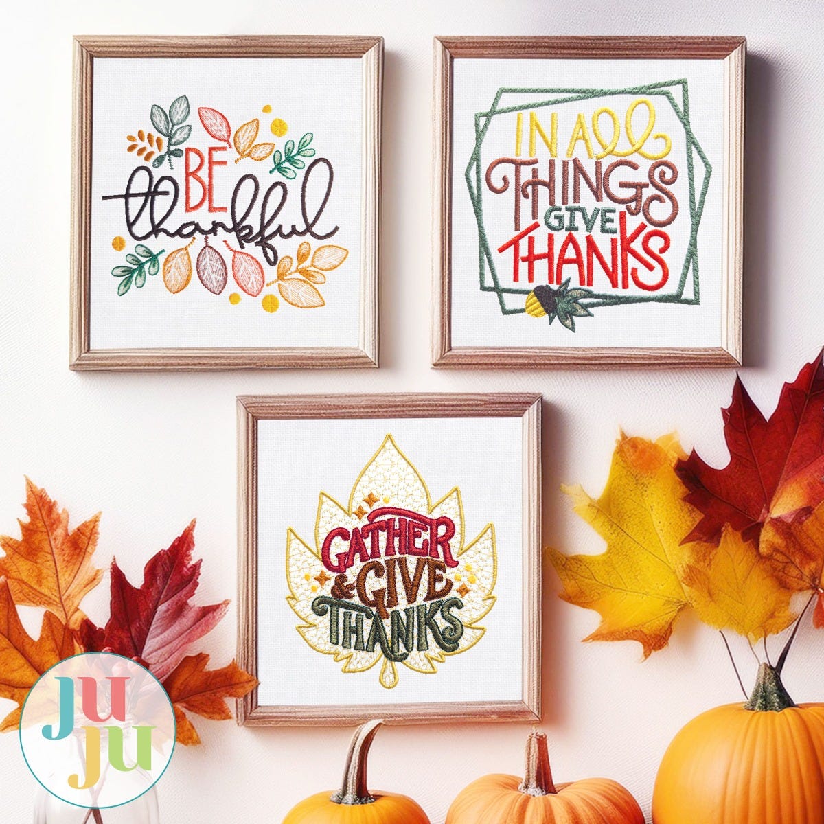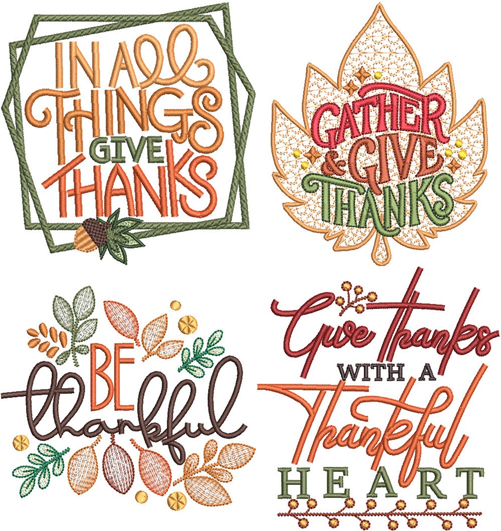 Four beautiful harvest themed word art designs featuring satin stitch lettering with a blend of satin, sketch, motif