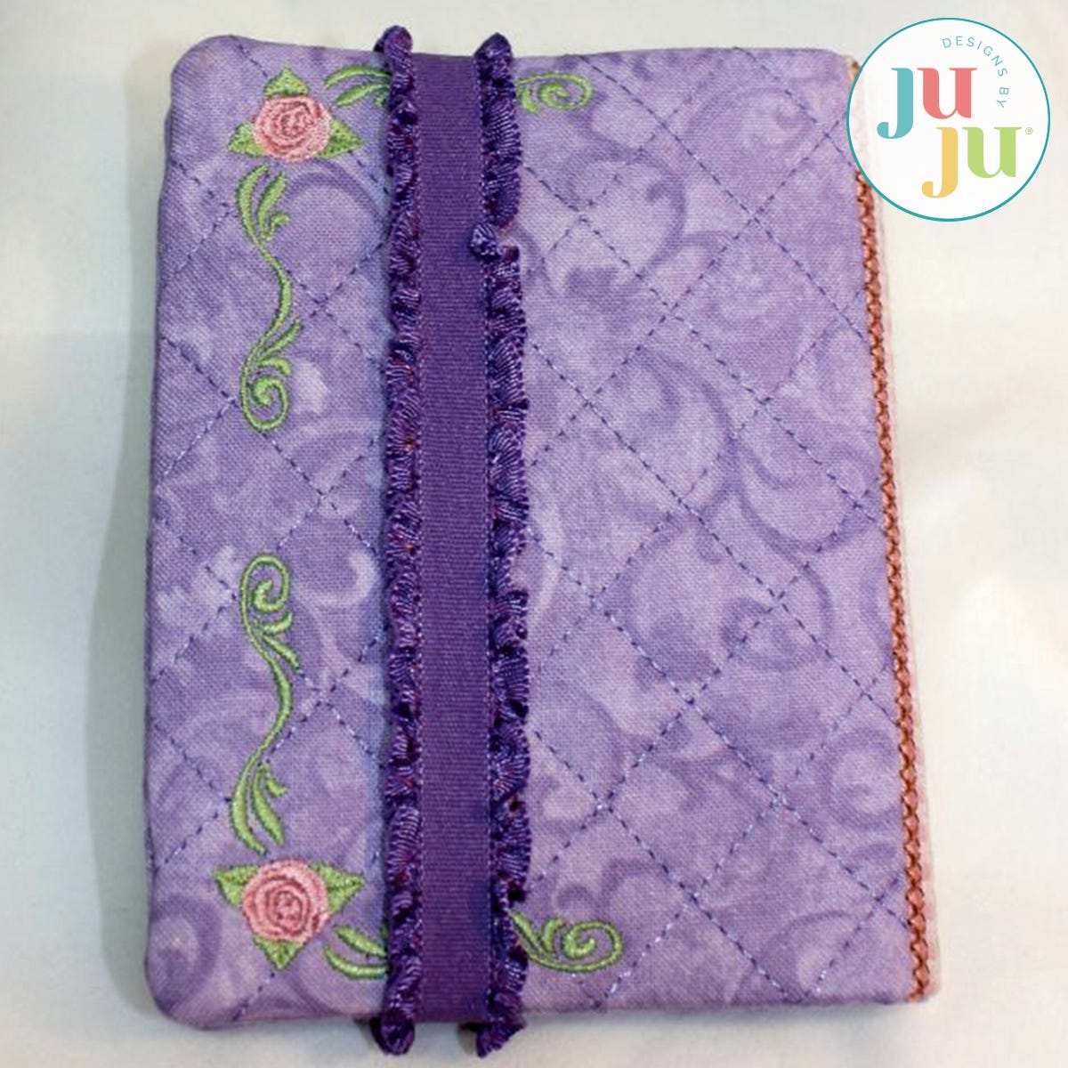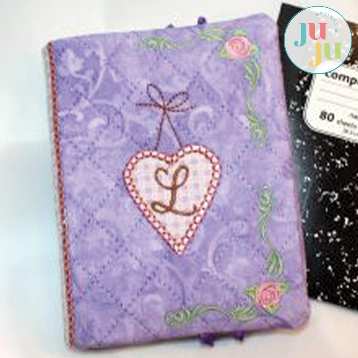The cover is quilted, then embroidered, and has a convenient elastic strap that helps keep the notebook closed when not in use. Both the little heart and the back spine are appliqued and finished off with the same decorative top stitching. All done in one hooping.