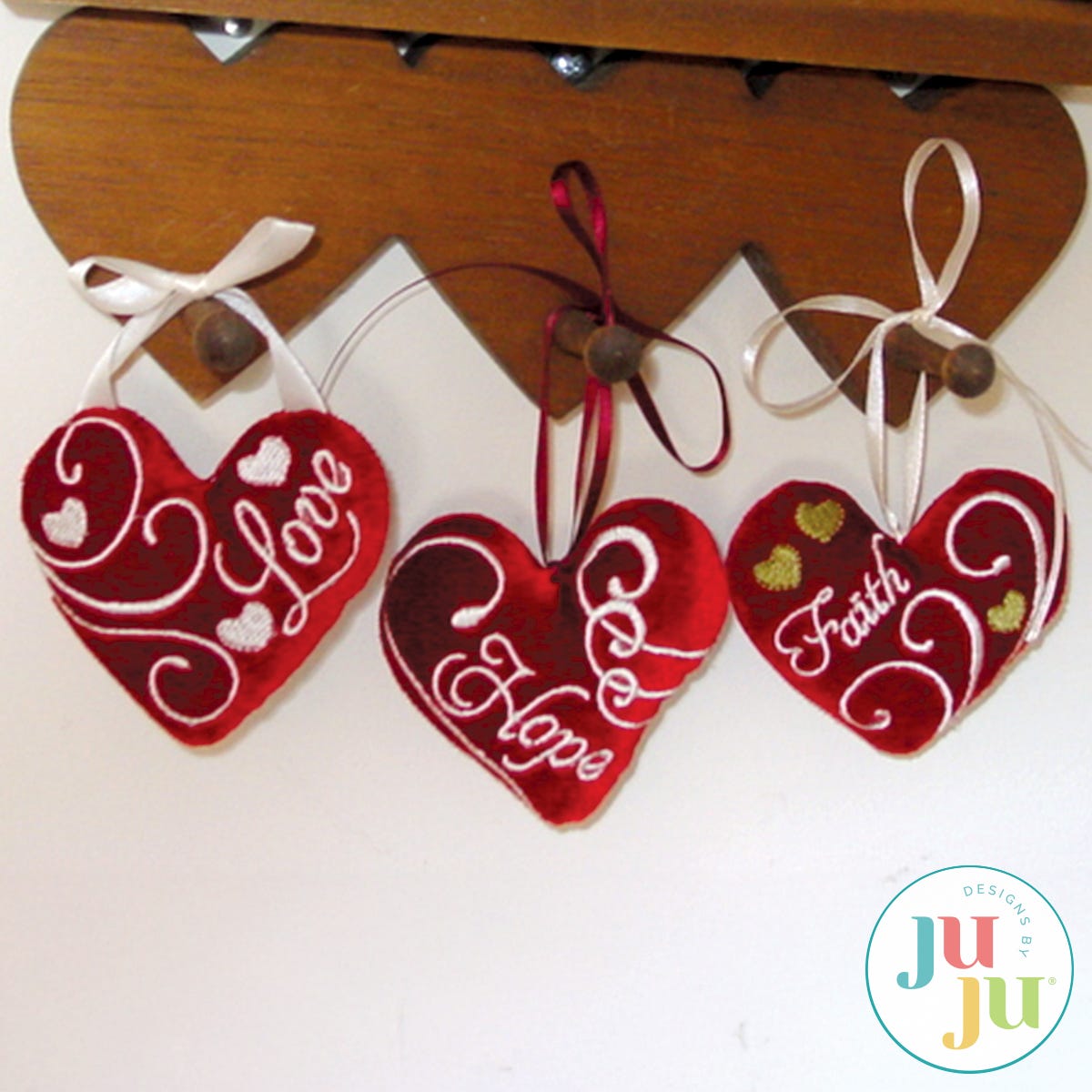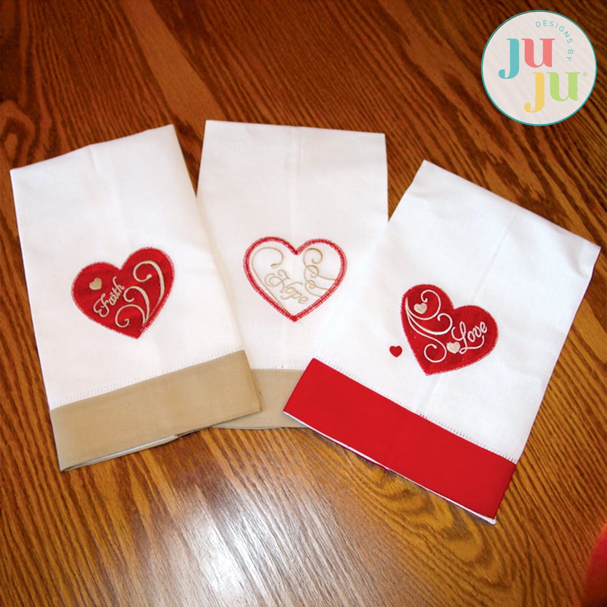 This is a coordinating set of 3 applique designs and 3 in-the-hoop small heart pillows (6 Designs total). This set is perfect for Valentines or weddings, but certainly can also be displayed year round as a symbol of faith, hope, and love. Hang the little heart pillows from gift packages, door knobs, peg boards as little whimsical accents. Beautiful stitched on velvet as well. A quick in-the-hoop project that only needs a small amount of handstitching for closing a small opening on the side of the pillow. The applique designs can be used for guest towels, pillows, blankets and so much more. Total of 6 designs.