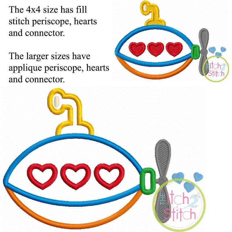 The 4x4 size has fill stitch periscope, hearts and connector.