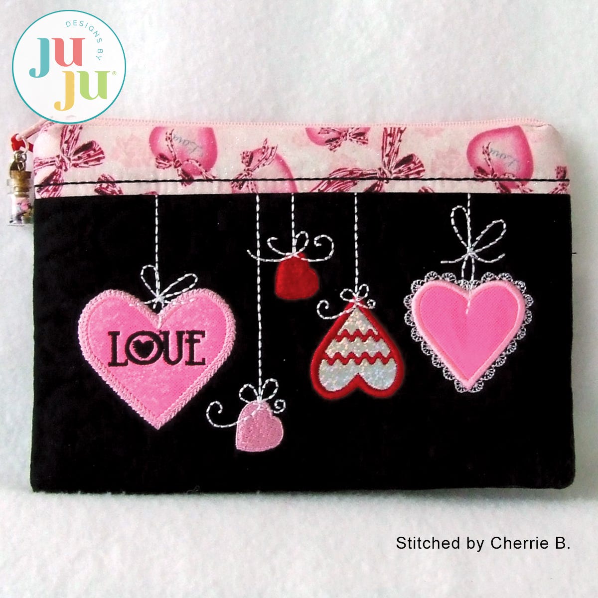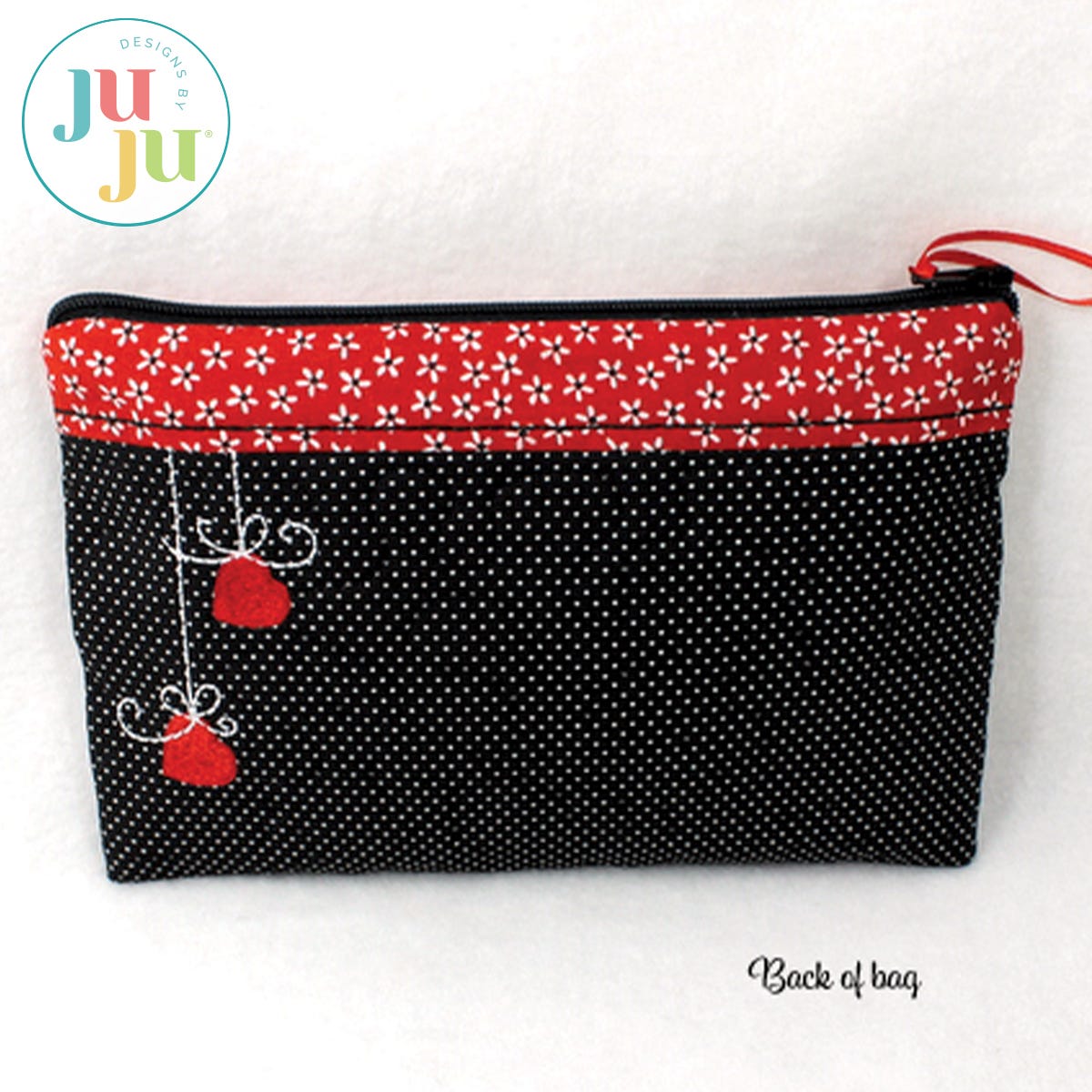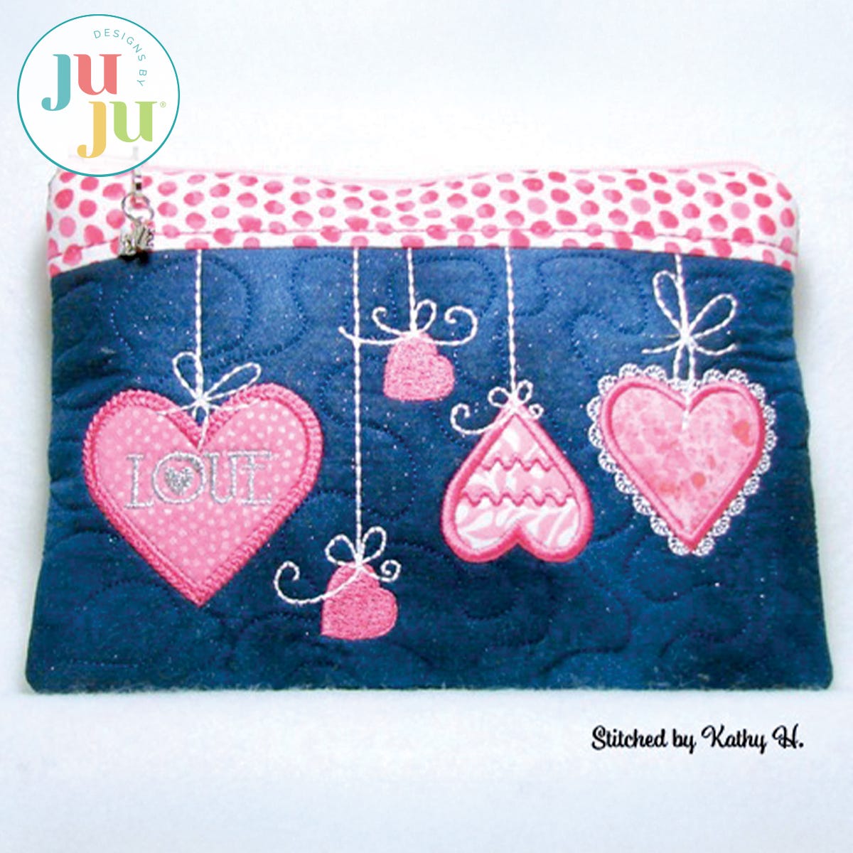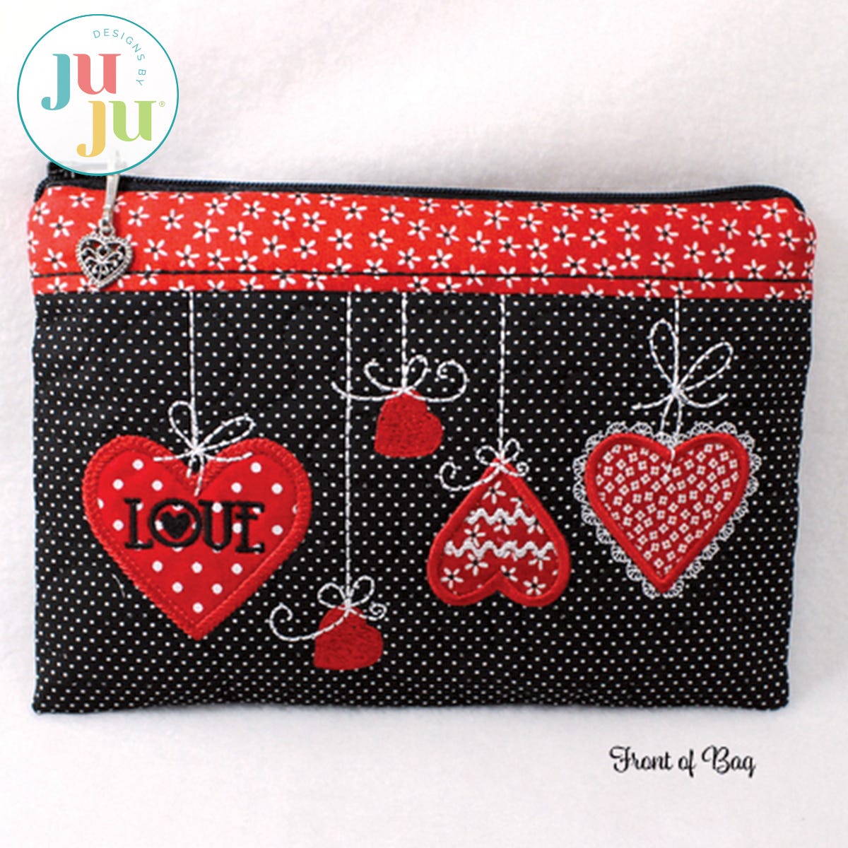 This top zippered bag is a mostly in the hoop project. The zipper and the applique hearts are applied in the hoop. If you have never done this before, you will be amazed at how easy it is do so. The background of both the front and back are quilted. The back has an additional small heart motif. The bag is fully lined; no seams are visible. The construction of the bag requires 3 hoopings. The side seams get finished on the sewing machine.