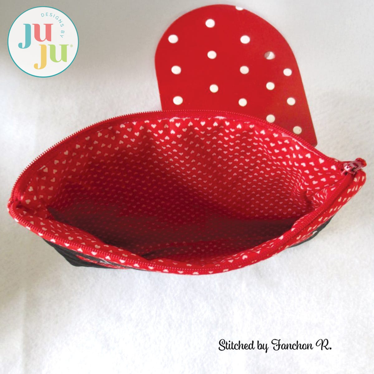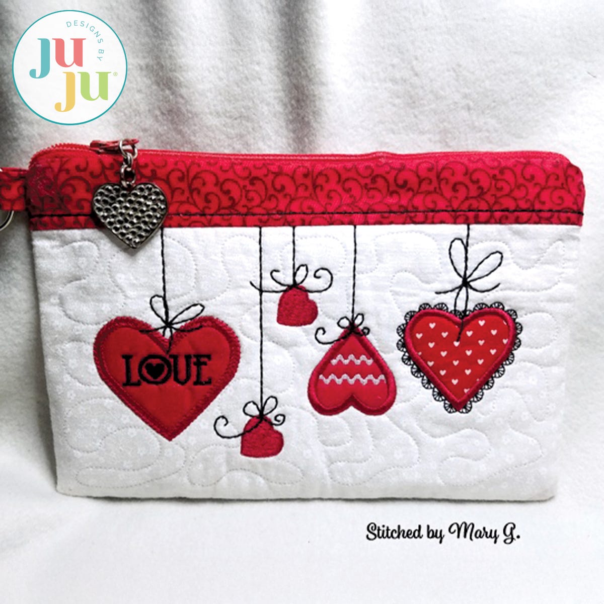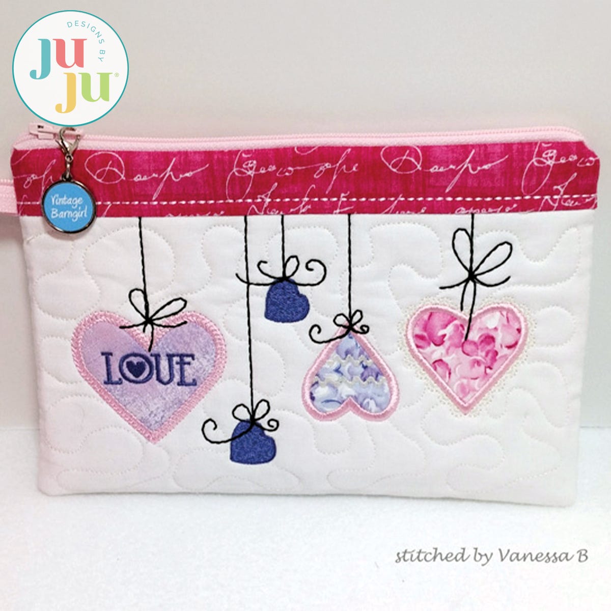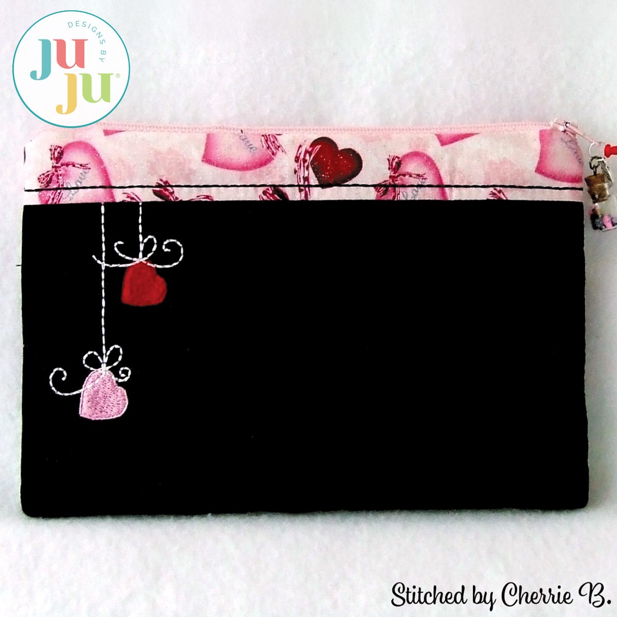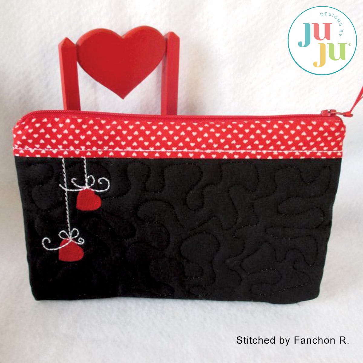 This top zippered bag is a mostly in the hoop project. The zipper and the applique hearts are applied in the hoop. If you have never done this before, you will be amazed at how easy it is do so. The background of both the front and back are quilted. The back has an additional small heart motif. The bag is fully lined; no seams are visible. The construction of the bag requires 3 hoopings. The side seams get finished on the sewing machine.