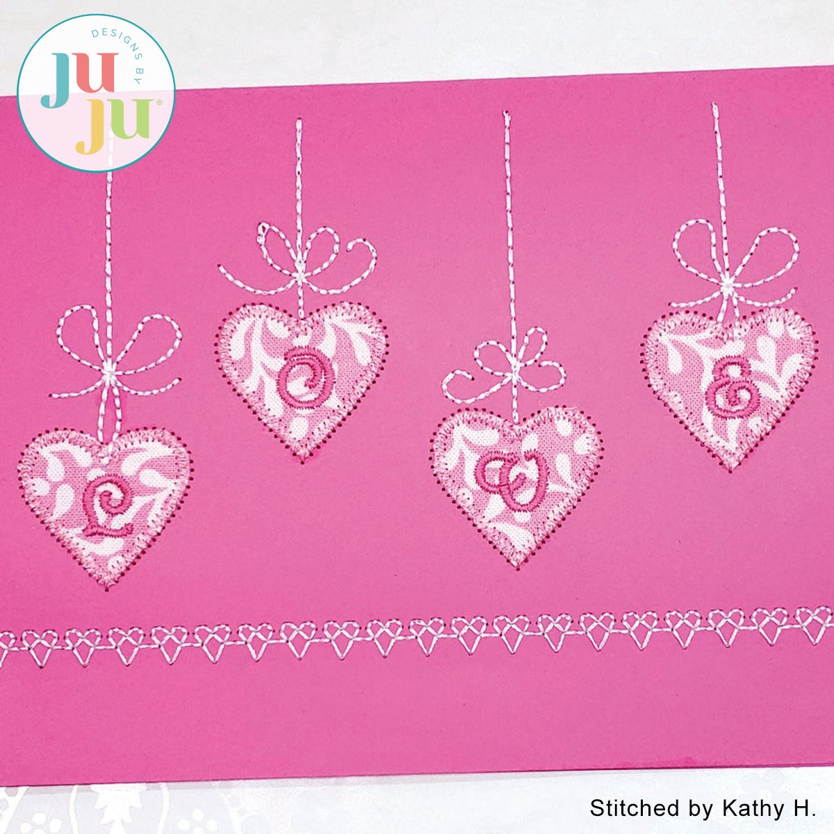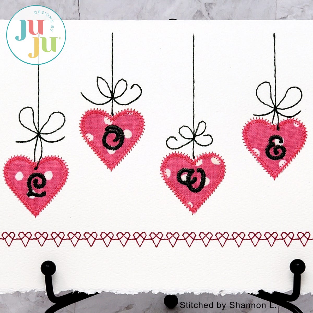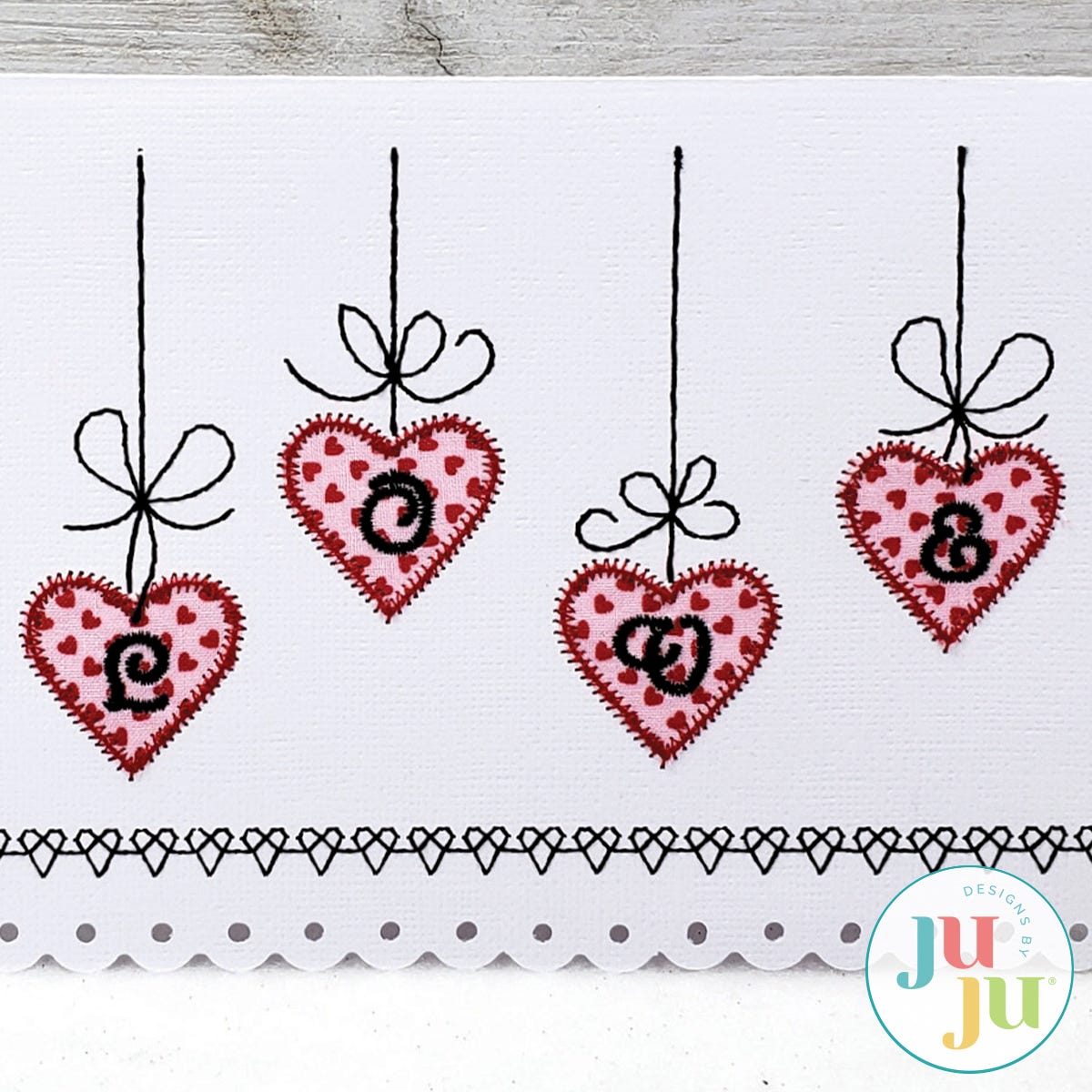 Embroidered greeting cards are fast and fun to make. This card has been digitized to be stitched on cardstock or blank greeting cards. The hearts are appliqued (we show you how, if you have never done this before).